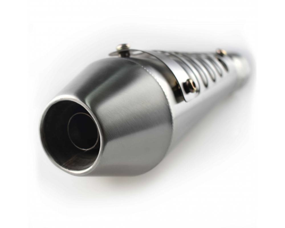 42MM Innendurchmesser am Anschluss. Hergestellt aus rostfreiem Stahl. Er ist handgefertigt und dies ist ein echter Scrambler-Dämpfer. Sie werden mit einem Bügel und einer Klemme zur Befestigung geliefert. Die Länge des Schalldämpfers beträgt 335 mm.