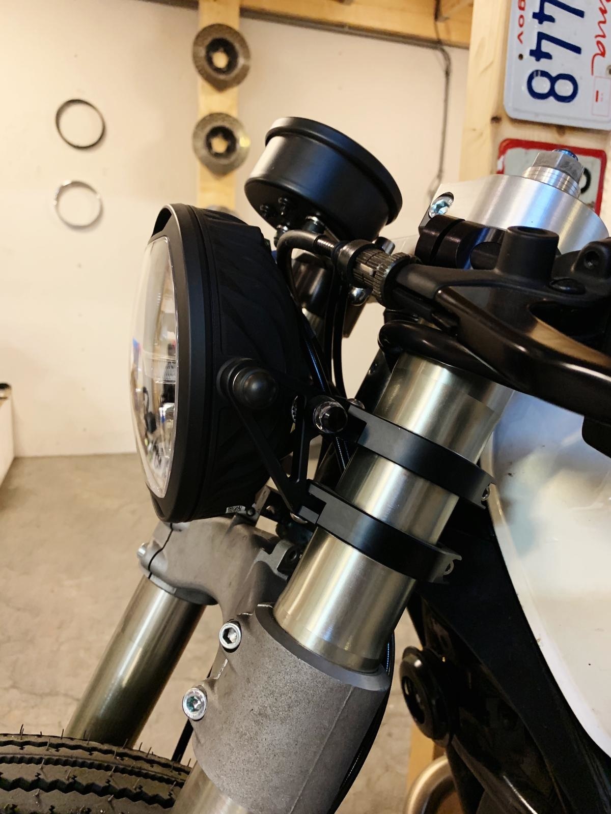Scheinwerfersatz aus CNC-gefrästem Aluminium. Die Halterungen sind auf die Breite des Scheinwerfers einstellbar. An der Halterung können Anzeigen mit einer Schraube bis zu M10 montiert werden. Sie können Ihre gewünschte Klemmengröße auswählen.