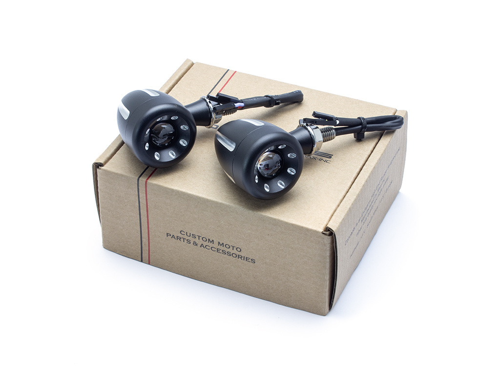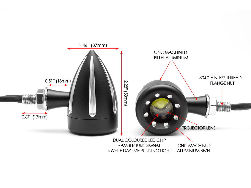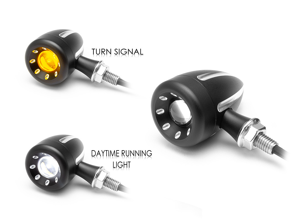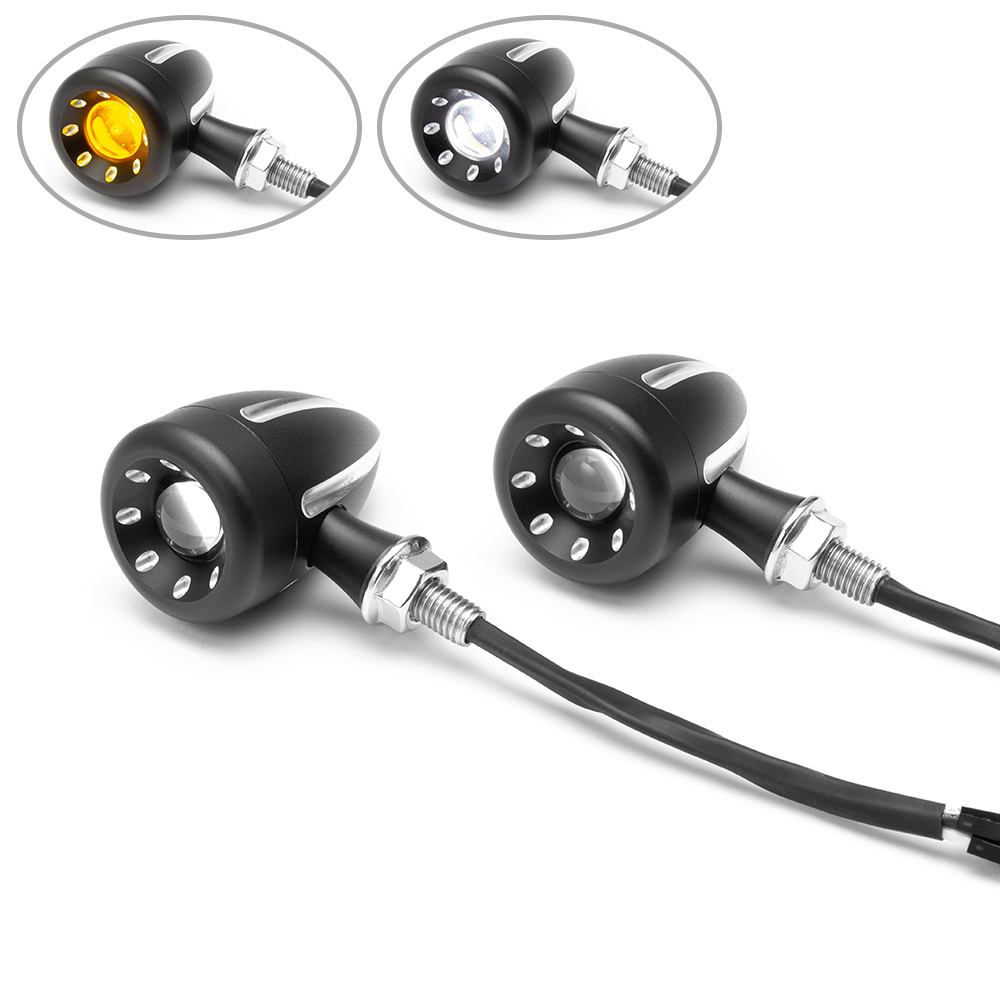 Diese integrierten LED-Blinker sind CNC-gefräst, superhell und von sehr hoher Qualität. Sie bieten eine einzigartige Lösung für die Front Ihres Motorrads und kombinieren Blinker und Tagfahrlicht, die eine verbesserte Sichtbarkeit und einen coolen Look bieten, alles in einem kleinen und diskreten All-in-One-Gehäuse. Sie verfügen über einen superhellen zweifarbigen 3-W-Cree-LED-Chip und eine Projektorlinse, die das Licht vergrößert. Die zweifarbige LED wechselt die Farbe zwischen den Funktionen - eine gelbe LED für Ihre Blinker und eine weiße LED für Ihr Tagfahrlicht.