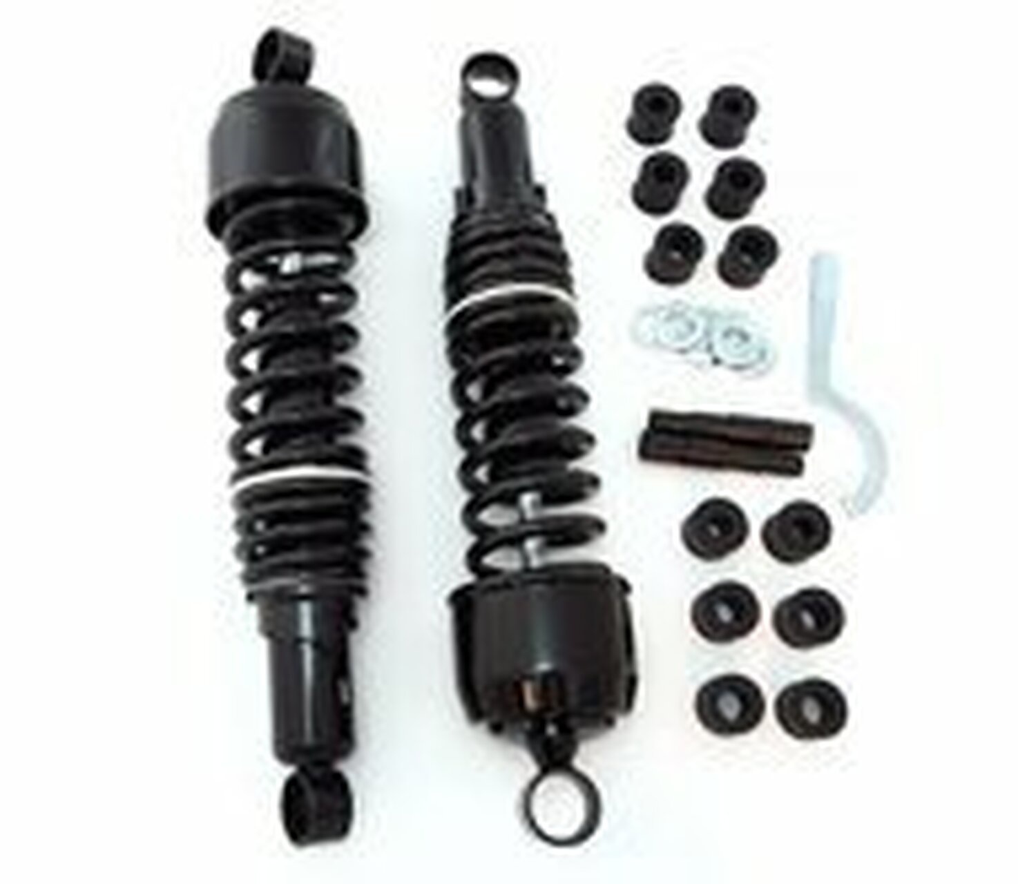 Emgo Ersatzdämpfer in Schwarz mit Abdeckungen. Mit einer Länge von 335 mm passen sie hervorragend auf viele alte japanische Motorräder wie das KZ900A, das GS650EX usw.