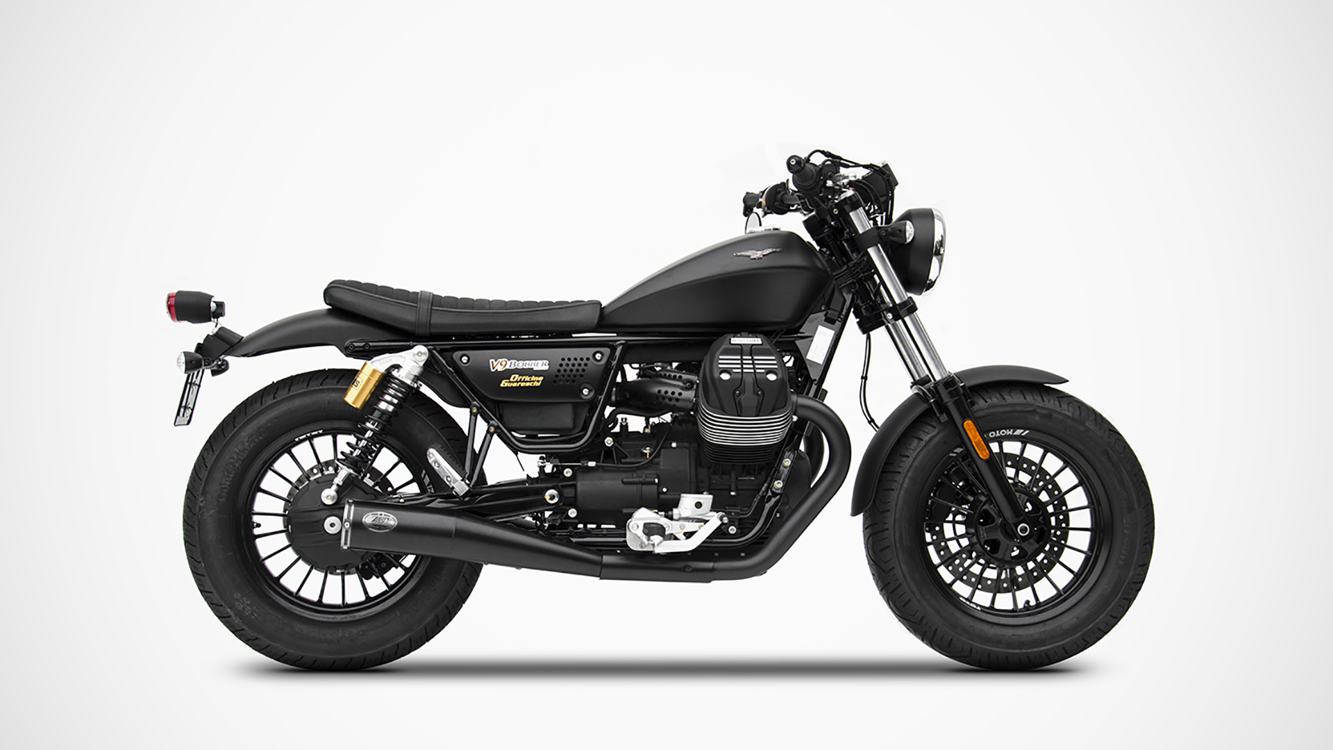 Auspuff Moto Guzzi V9 Bobber-Roamer 16-19, Edelstahl Schwarz, langer Slip-On, E-Markierung, Euro4