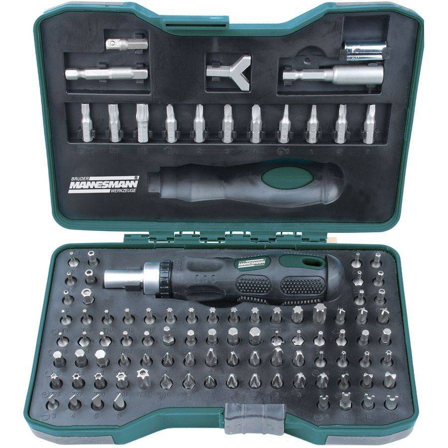 Bitset, 101 Stück. Sehr komplett mit 95 Bit (25 mm) aus Stahl S2 Schlitz, Phillips PH und PZ, 2-3 und vier Flügel, zweipolige, Sechseck und Inbus mit Bohrungen (metrisch und Zoll) Platz, viele Zähne und Bits gesetzt für interne und externe torx in verschiedenen Größen. Das Set kommt in einem robusten Kassettenratschenschrauber (umschaltbar), magnetischer Bithalter, Bit-Adapter, 25 und 50 mm Adapter für 1/4 "Buchsen und Schraubenhaken Bit.