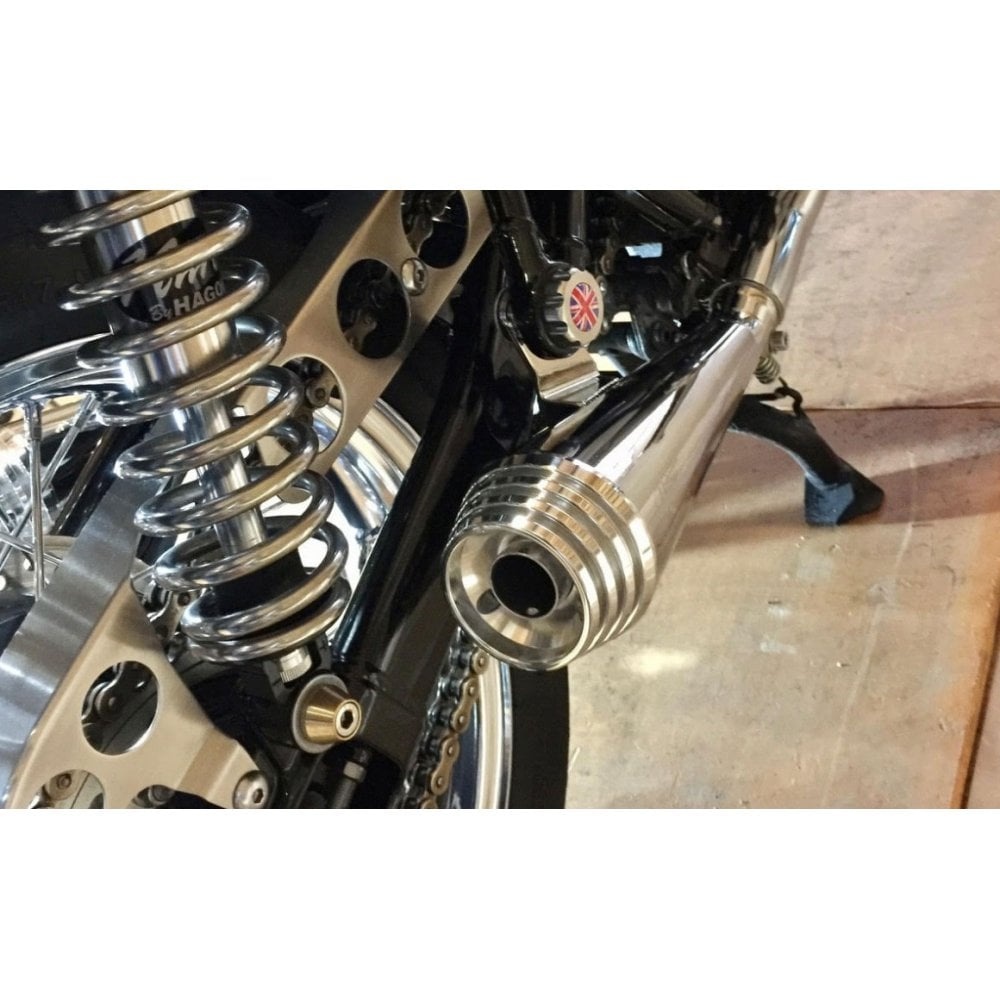Saturn V - Auspuffanlage für T100 und T120 Triumph Bonnevilles 2016 und höher. Sie hat zwei Slip-on Schalldämpfer aus Edelstahl mit CNC-gefrästen Endkappen aus Billet.