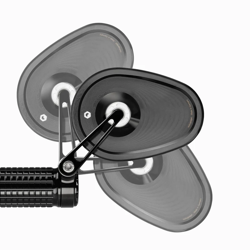 Spiegelkörper, Spiegelarm und die Klemmung für das Lenkerende werden auf CNC-Maschinen aus dem vollen Aluminium gefräst und hochwertig eloxiert. Alle Schrauben bestehen aus Edelstahl. Durch das präzise Kugelgelenk lässt sich der Spiegel komfortabel und sehr stabil einstellen. Glasbruch oder herausfallendes Glas sind schlichtweg ausgeschlossen.