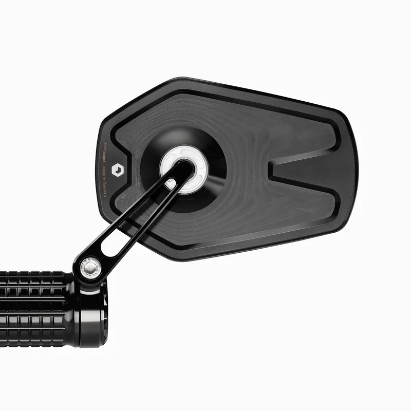 Der kleine Arm ist schwenkbar. Der Spiegel ist für die rechte und linke Seite geeignet. Die Montage kann direkt am Lenkerende (22 mm und 1 Zoll) oder, falls Griffe und Armaturen nicht versetzt werden können, mittels des mo.view Bar Adapters erfolgen.