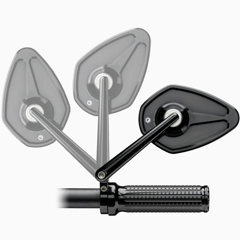 Spiegelkörper, Spiegelarm und Klemme werden auf CNC-Maschinen aus dem vollen Aluminium gefräst und hochwertig eloxiert. Alle Schrauben bestehen aus Edelstahl. Durch das präzise Kugelgelenk lässt sich der Spiegel komfortabel und sehr stabil verstellen. Gebrochene oder herausgefallene Gläser sind schlichtweg ausgeschlossen.