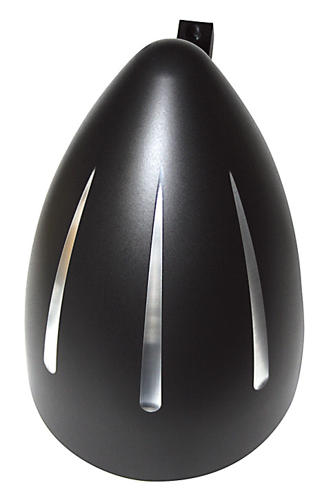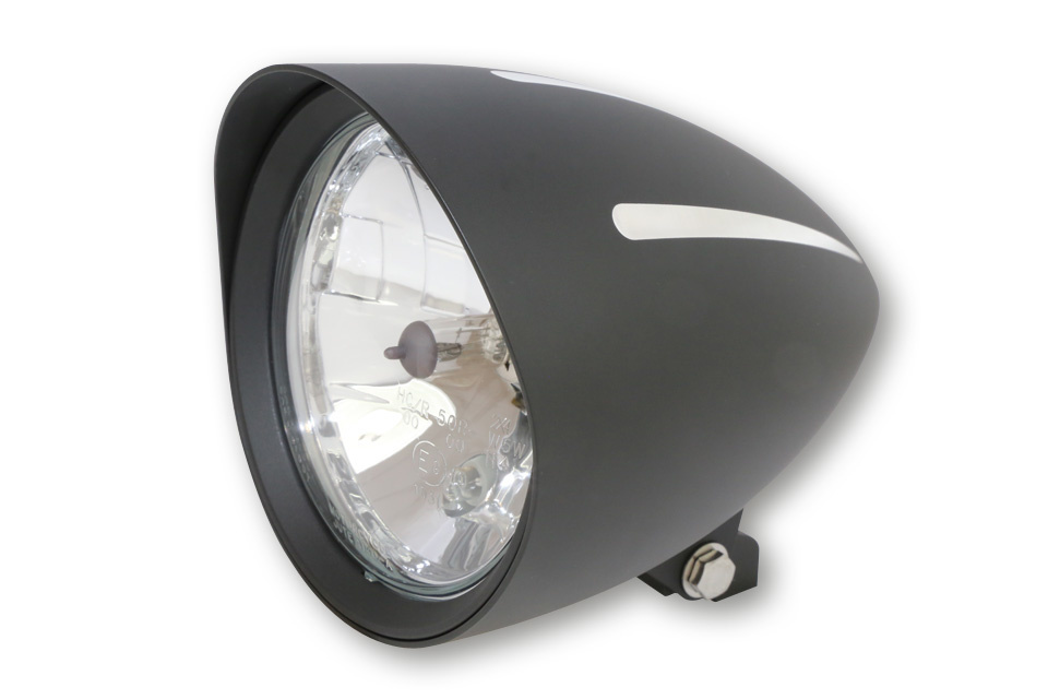 H4 Halogenscheinwerfer mit einem hochwertigen schwarzen Aluminiumgehäuse mit 3 markanten CNC-gefrästen Rillen und einem nostalgischen Regenschirm (Länge: ca. 25 mm) im Retro-Look. Der Scheinwerfer verfügt über einen asymmetrischen prismatischen Reflektor - nur für Rechtsverkehr zugelassen - und ein Standlicht mit E-Zulassung.