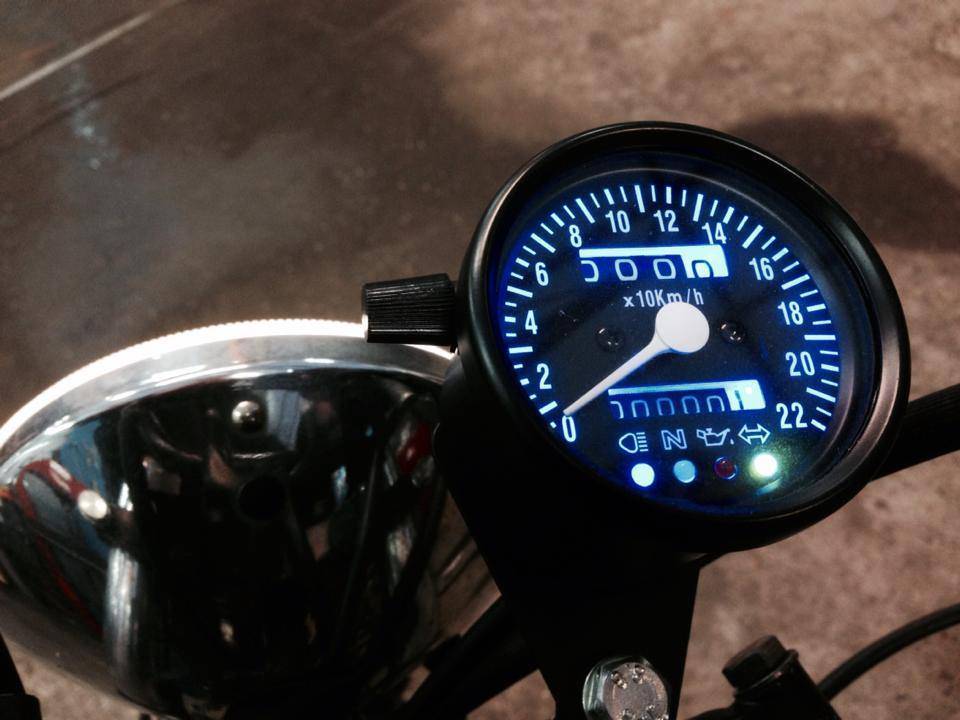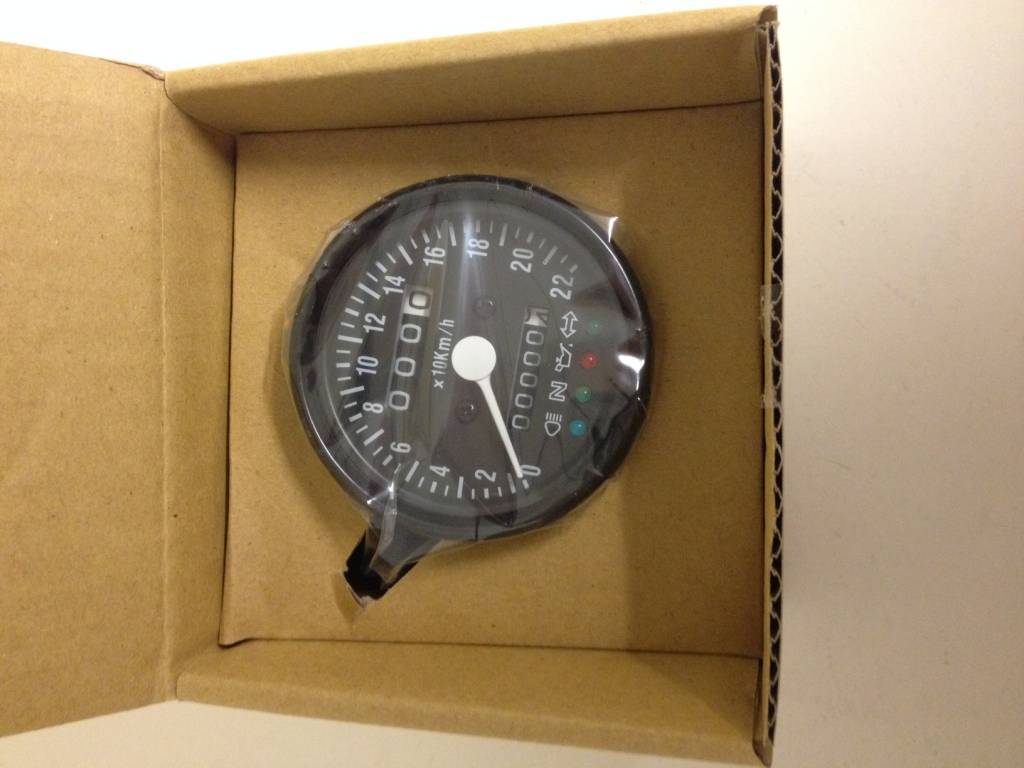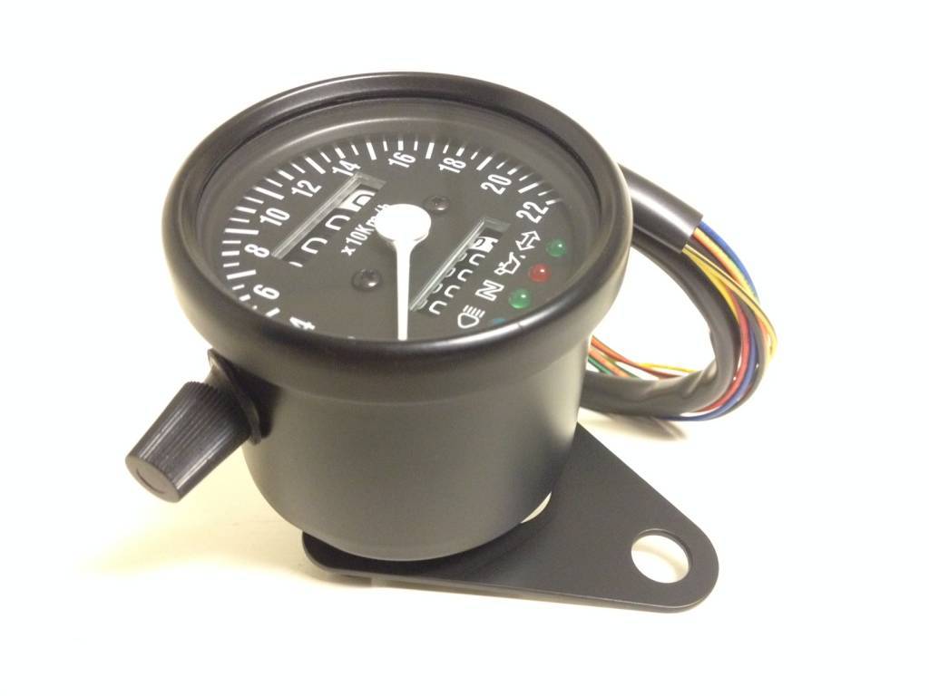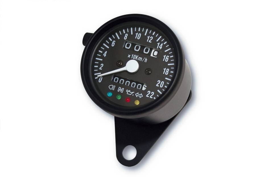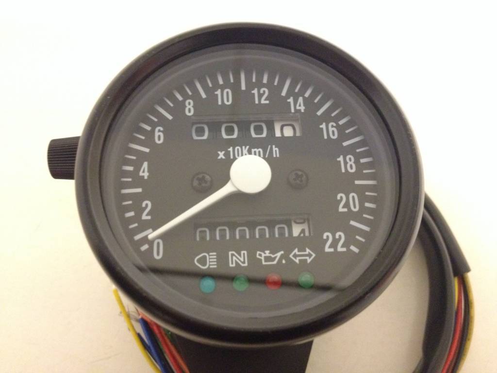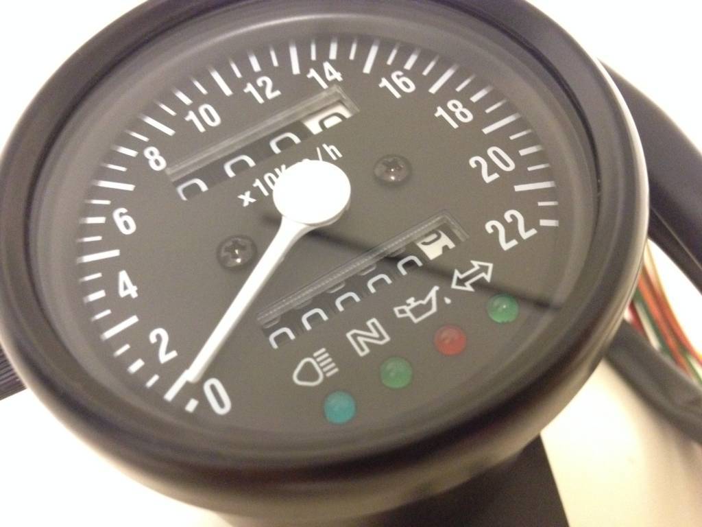 Tacho D= 60mm, schwarzes Metallgehäuse, schwarzes Ziffernblatt, bis 220 km/h, 60 km/h = 1400 RPM (K 1.4), mit Tageskilometerzähler, Weisse Hintergrundbeleuchtung, 4 Kontrollleuchten.