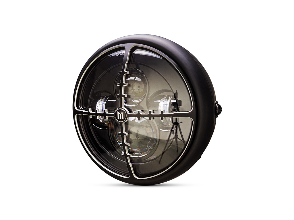 7" Cross Hair Multi LED Projector Headlight. Aiming for something cool? Well this unique headlight is of a high standard and id super bright. It has a classic style with side mounts and is featuring a multi-projector LED insert and CNC machined alloy Cross Hairs Grill design cover.