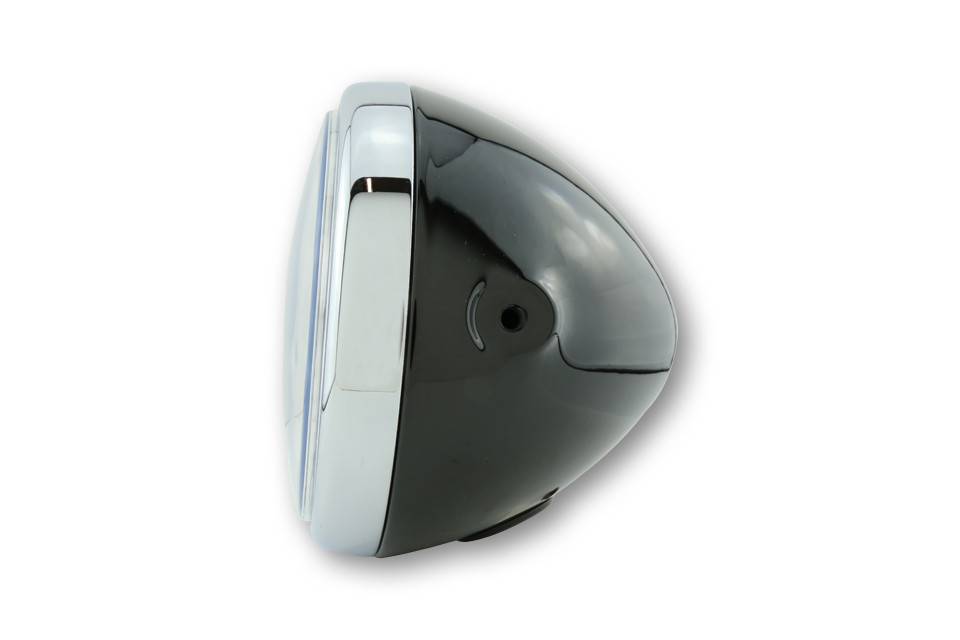Oval-shaped main headlight comes with a shiny black housing and chrome rim, for side mount. This model is a highlight for many motorcycles, because of its puristic design. Headlight comes with an H4 insert with high-beam, low-beam and parking light, symmetrical prism reflector and clear lens.
