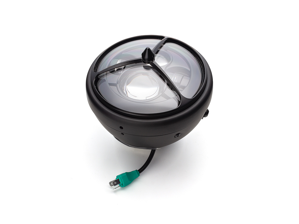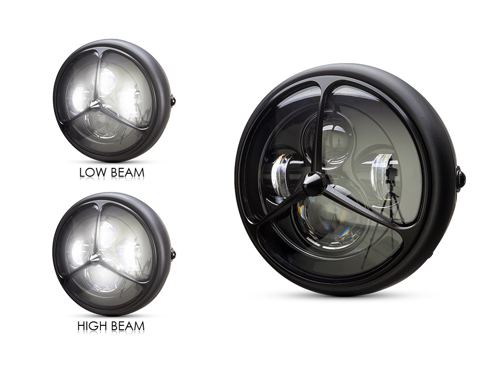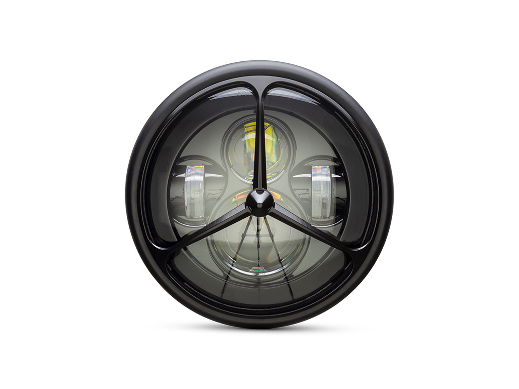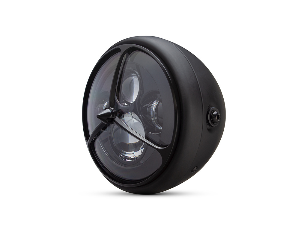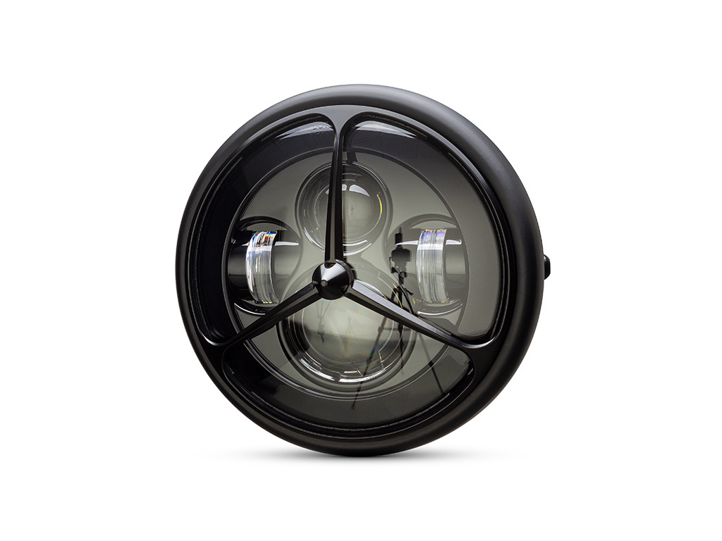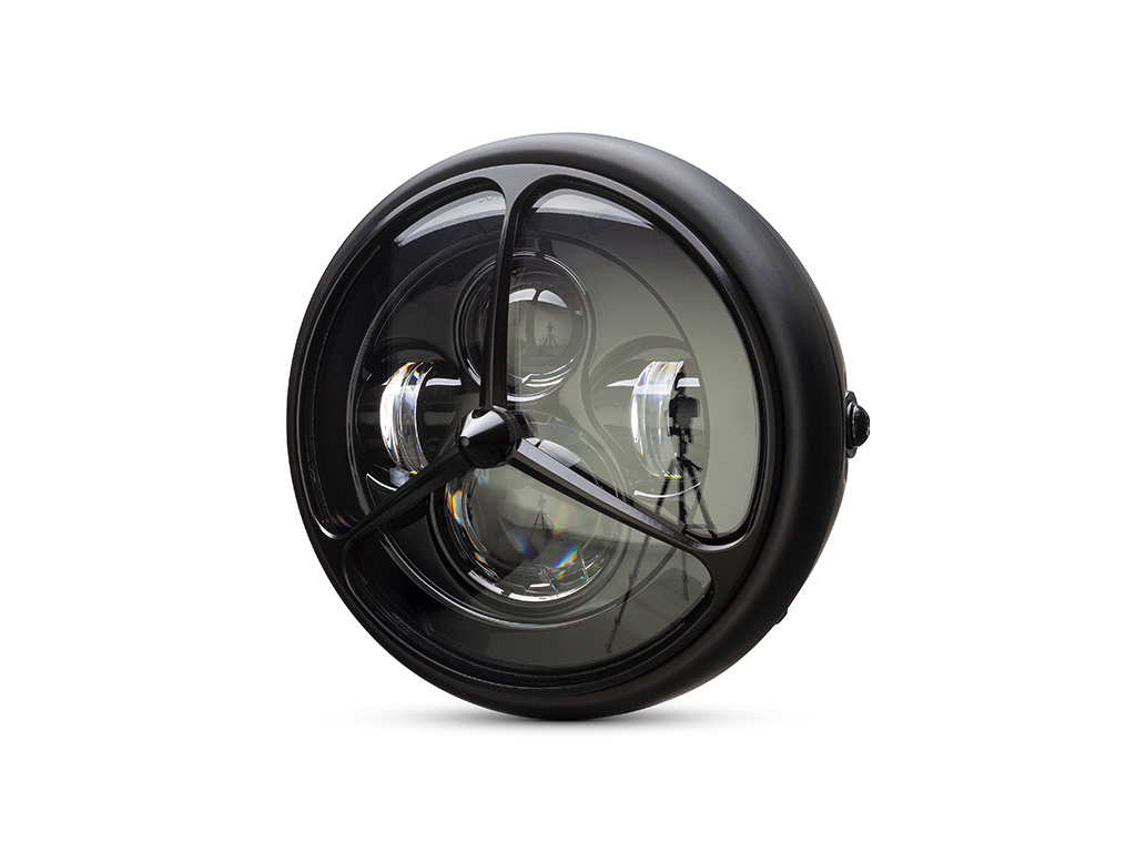 7" Trias Design Multi LED Projector Headlight . Aiming for something cool? Well this unique headlight is of a high standard and id super bright. It has a classic style with side mounts and is featuring a multi-projector LED insert and CNC machined alloy Cross Hairs Grill design cover.