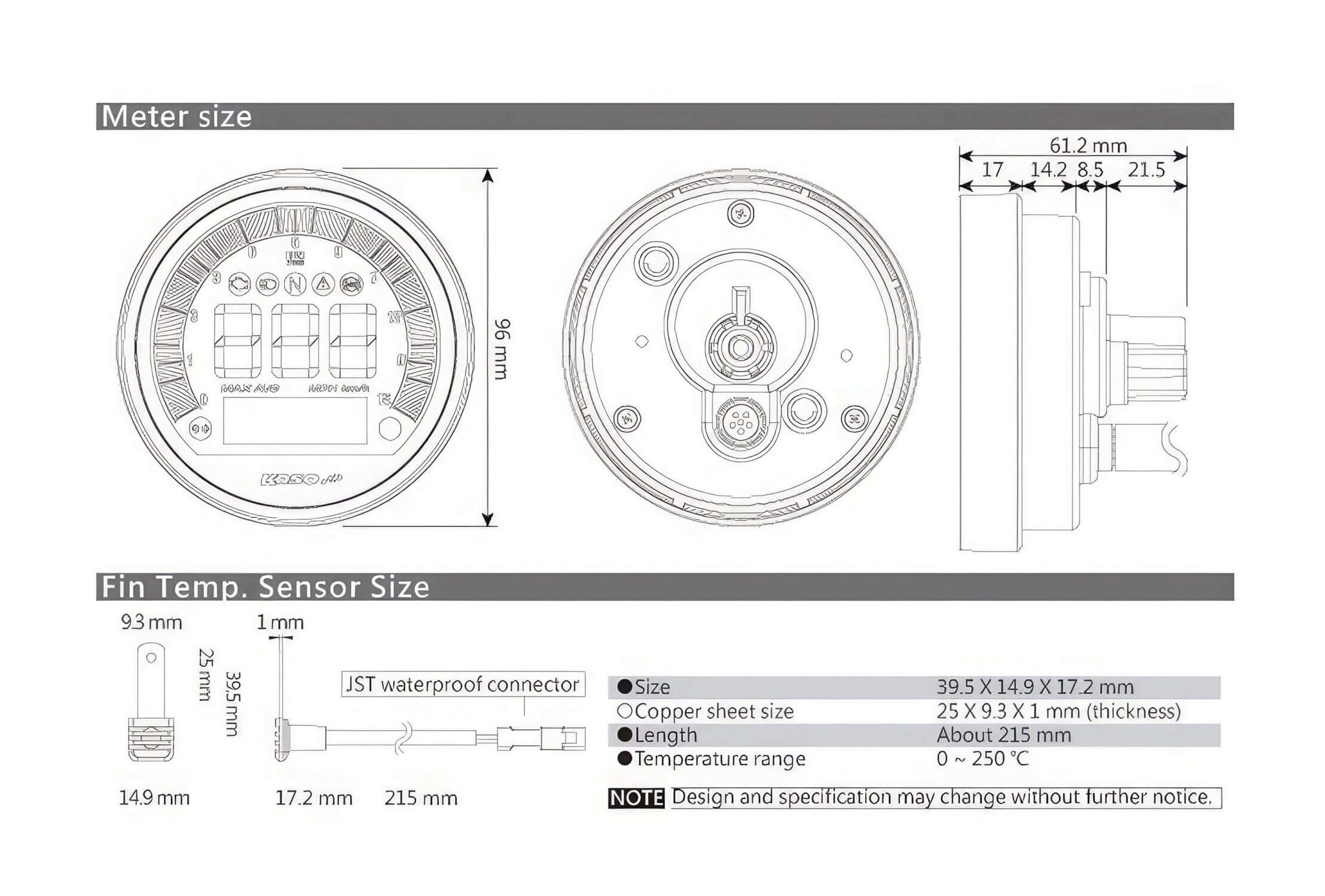- Indicators: Speed, RPM, turn signals, oil, temperature, fuel, high beam, ABS, idle