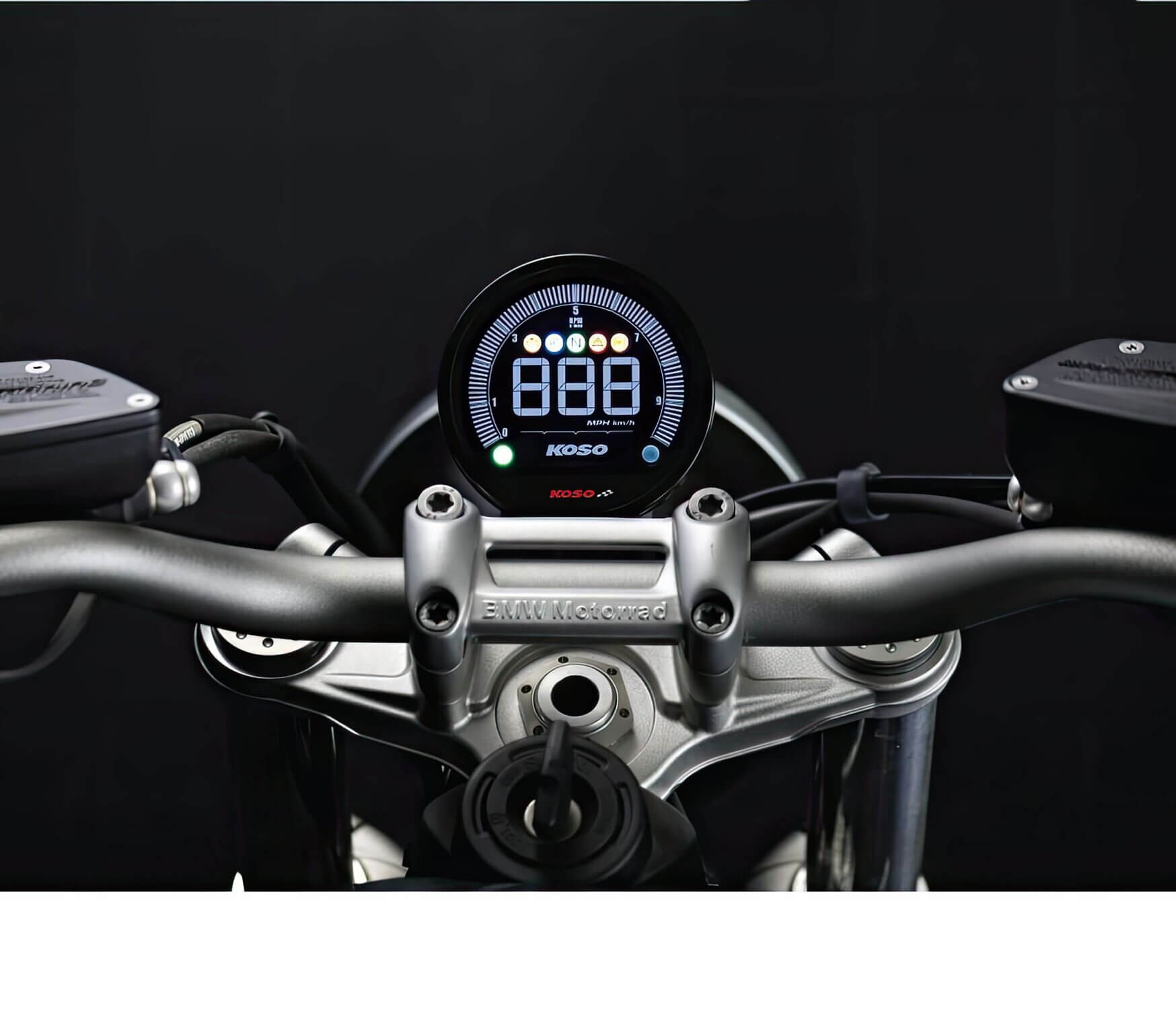 Plug & Play combined instrument from Koso, for BMW R nineT from 2017. The display is simple and easy to read. Due to its compact size, the speedometer fits all dashboards.
