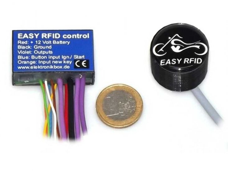 This easy RFID works with only one button. One press on the start button will activate the transponder module what looks for a key. The module will activate the ignition output if an identified key is beside the module area.