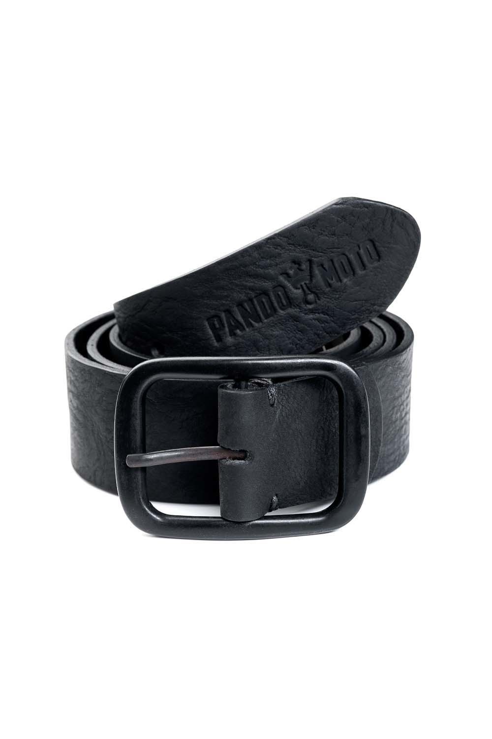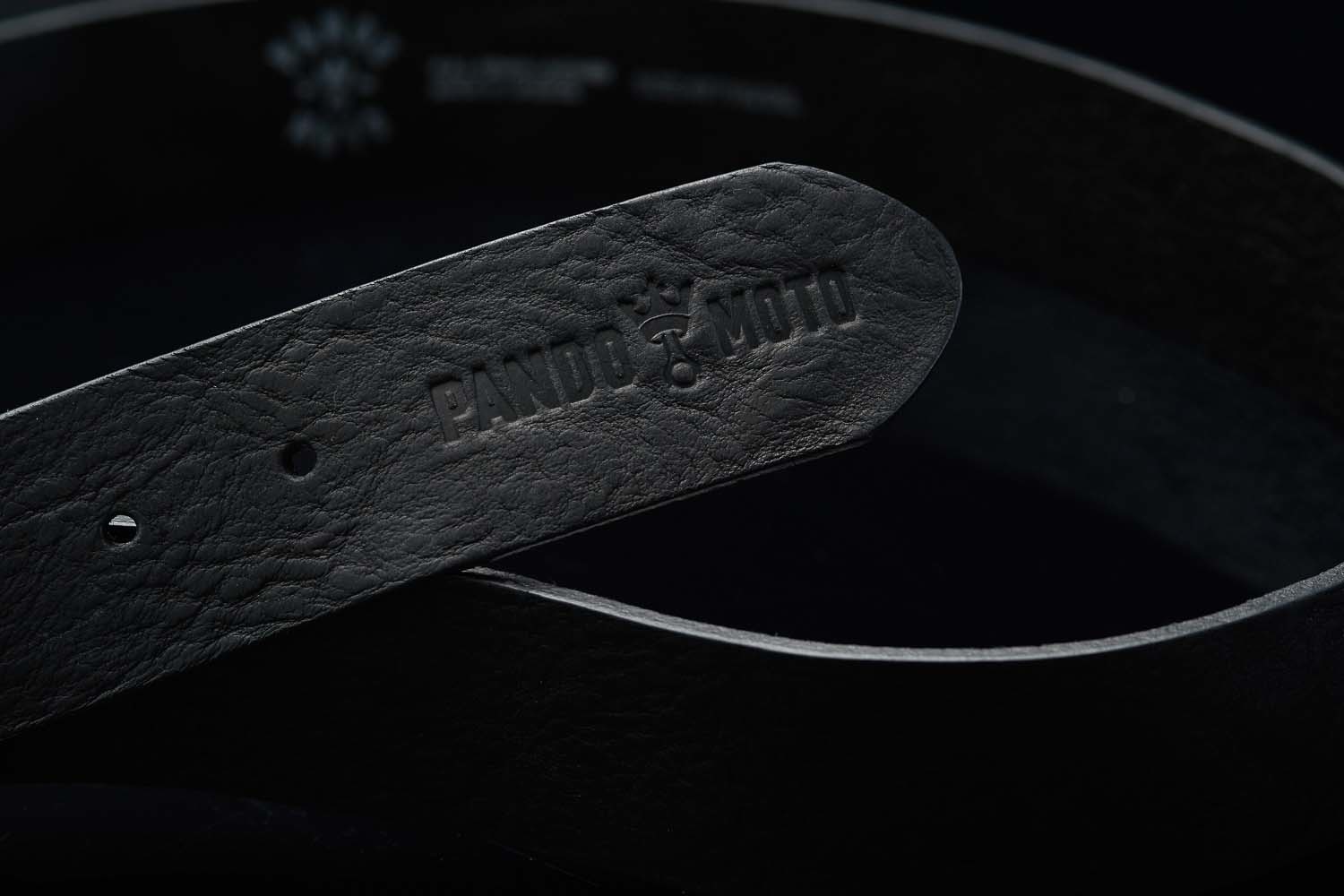 Genuine leather belt made in Greece. Specially designed by PANDO team. Galvanized metal matte black buckle perfectly matches the leather. Hot pressed PANDO MOTO logo at the tip.