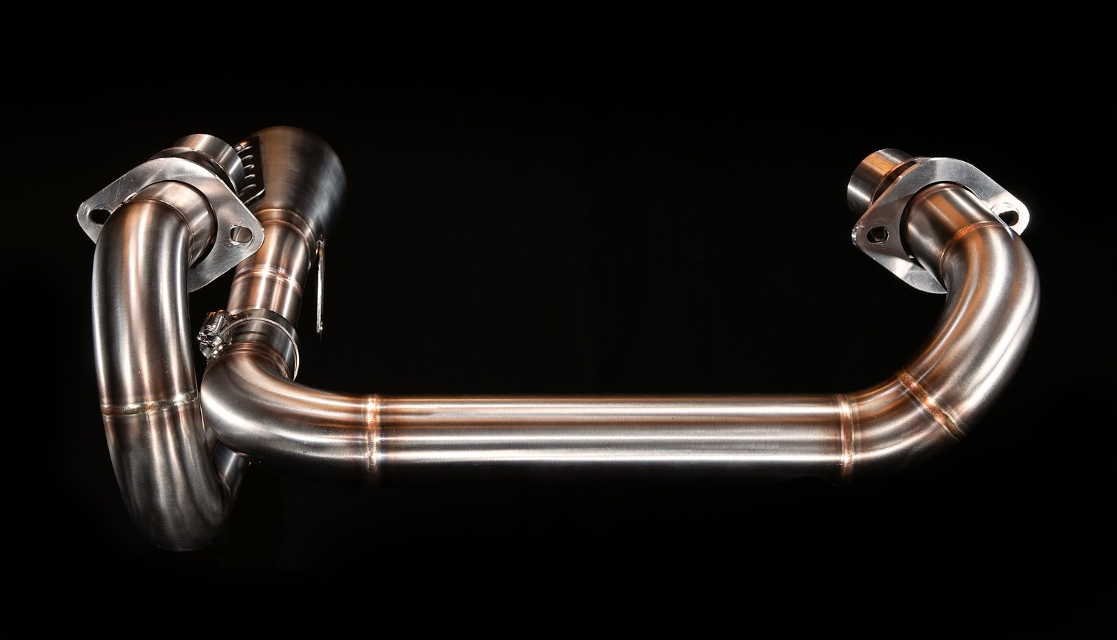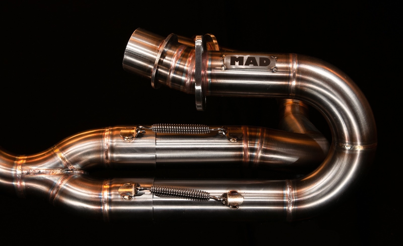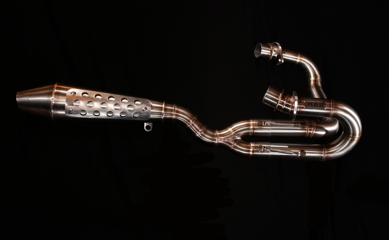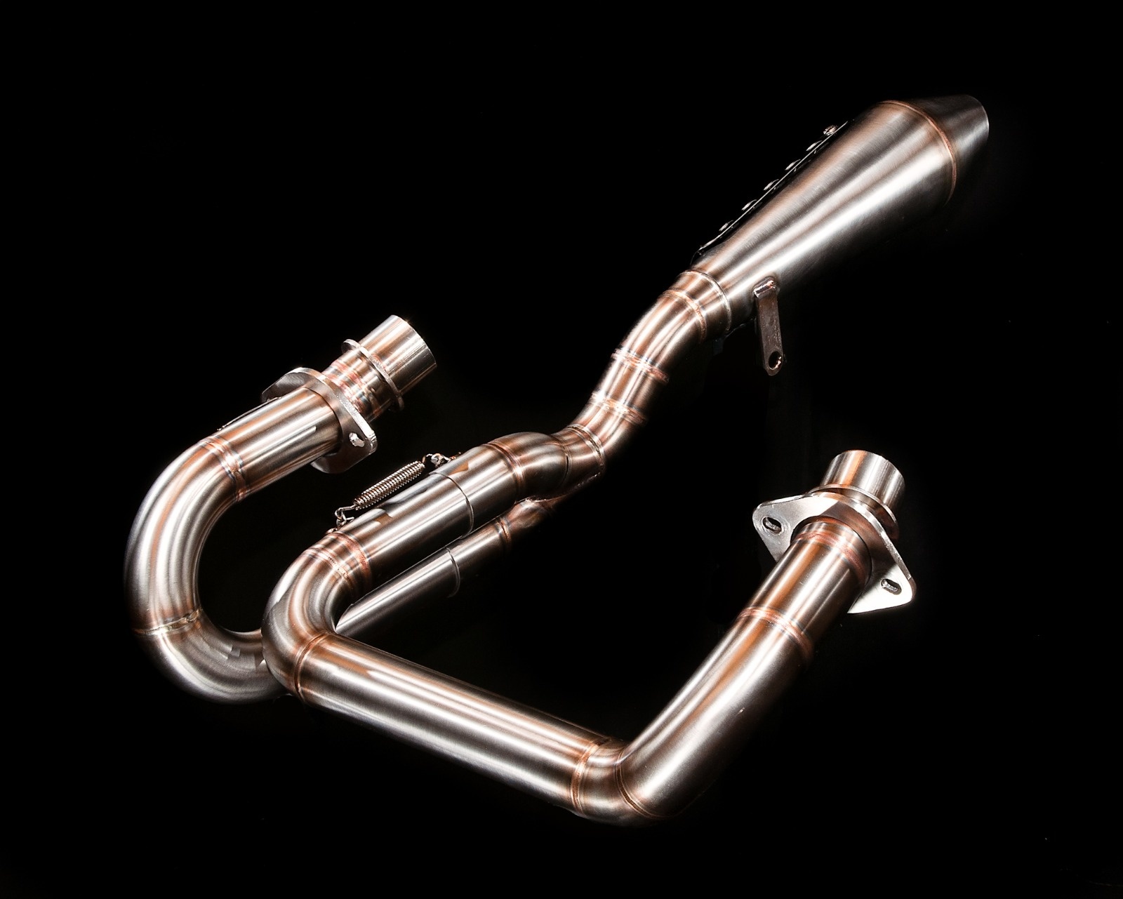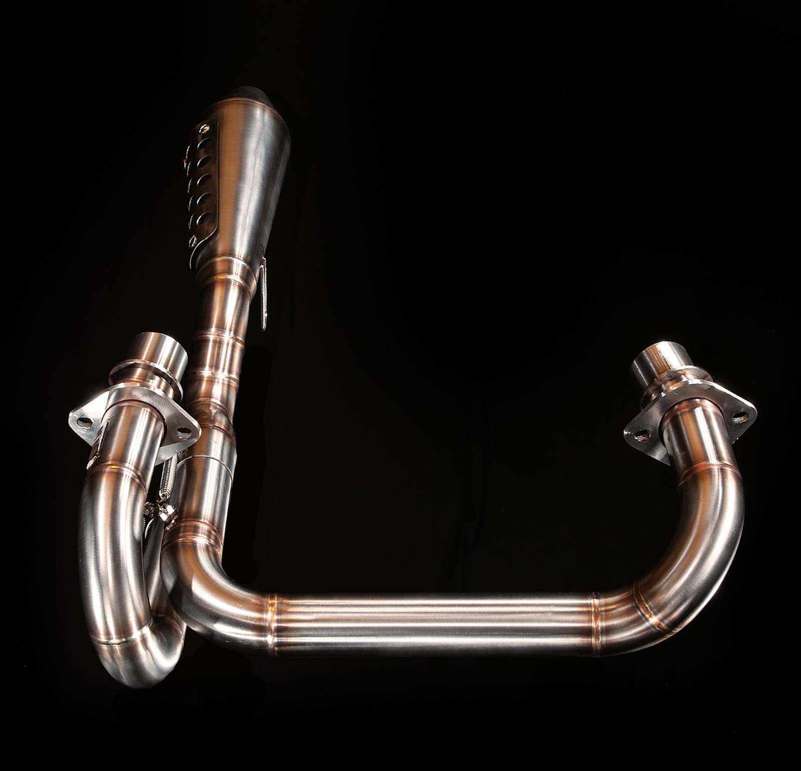 The exhausts are made from stainless. The tubes have a diameter of 44,5mm and the silencer fits onto a 44,5mm flange depending on the muffler you would like to order. The exhaust can be delivered with or without a silencer.