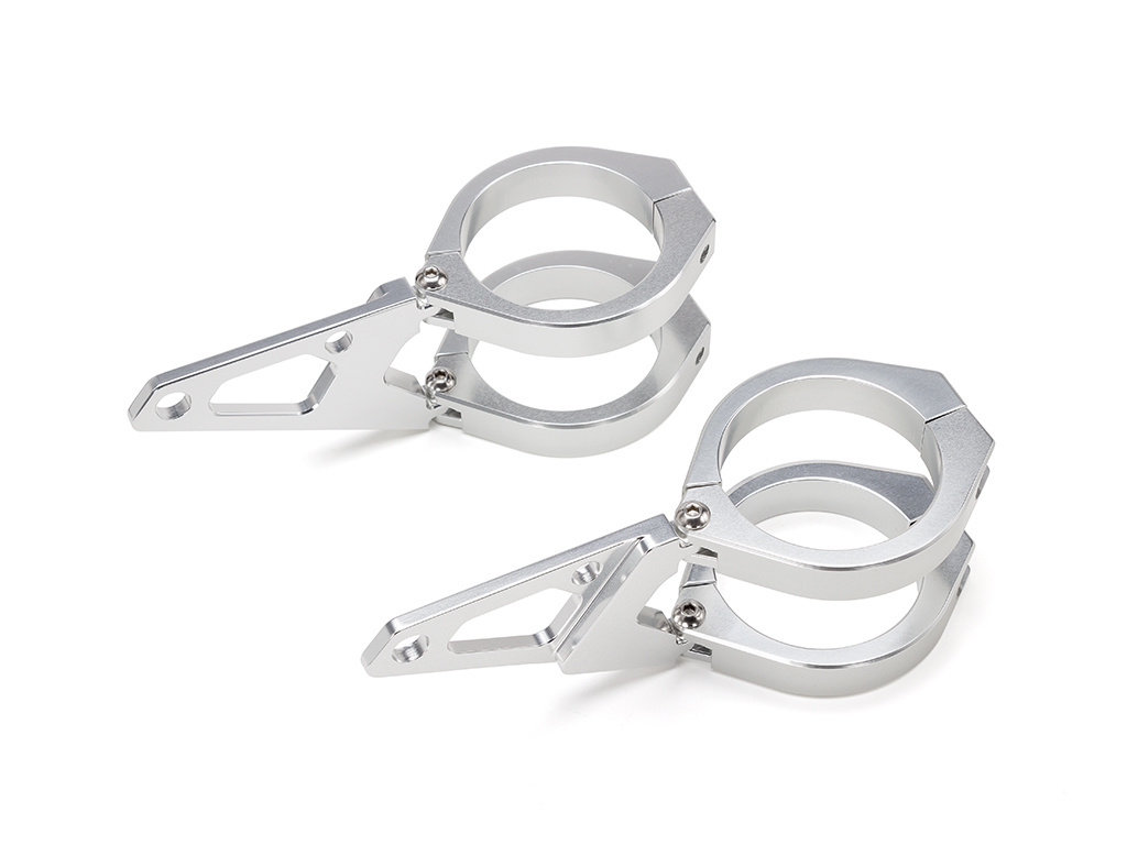 Each fork clamp comes in 2 separate pieces, allowing them to clamp onto the forks down without having to remove them from their yokes.