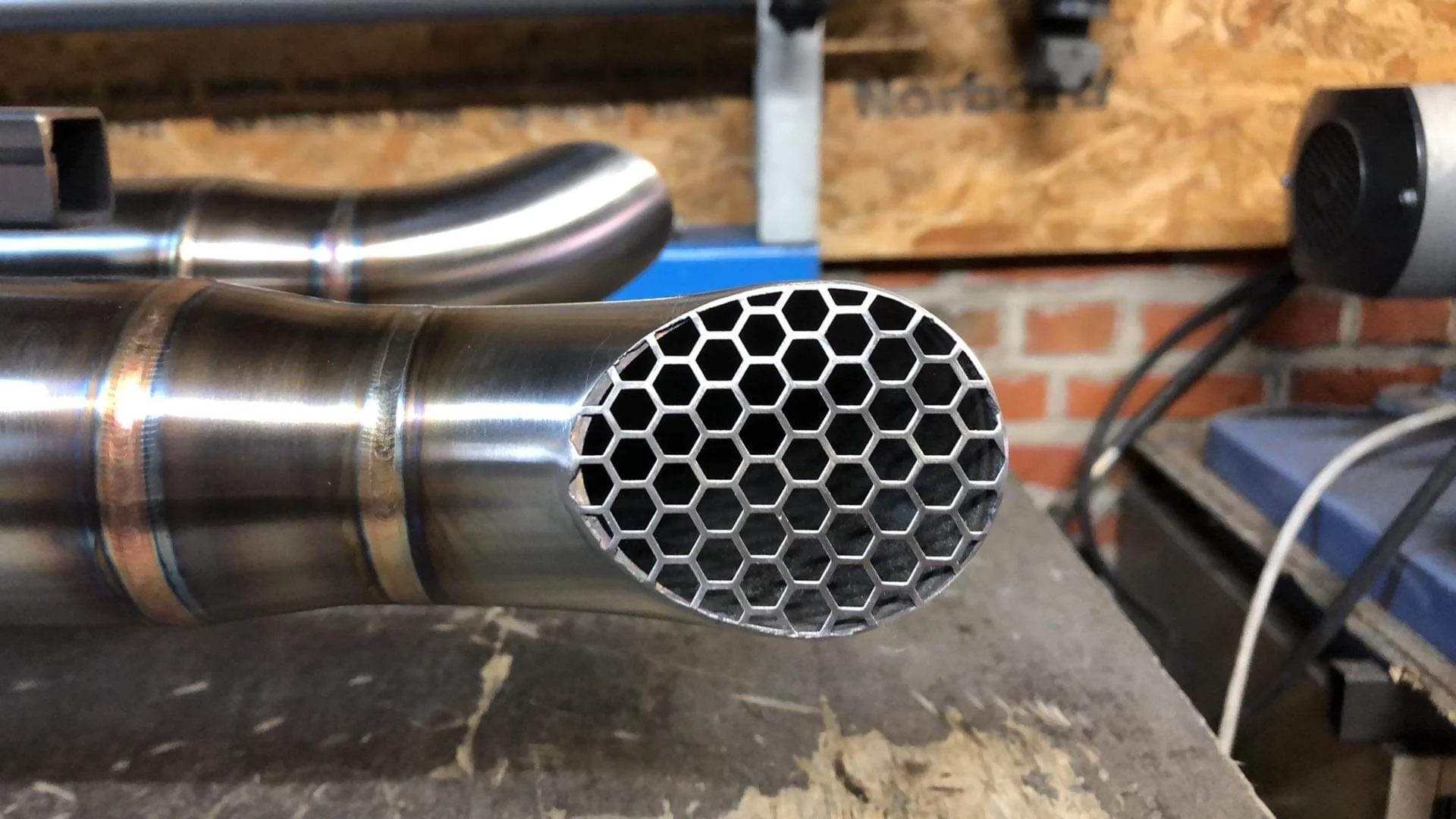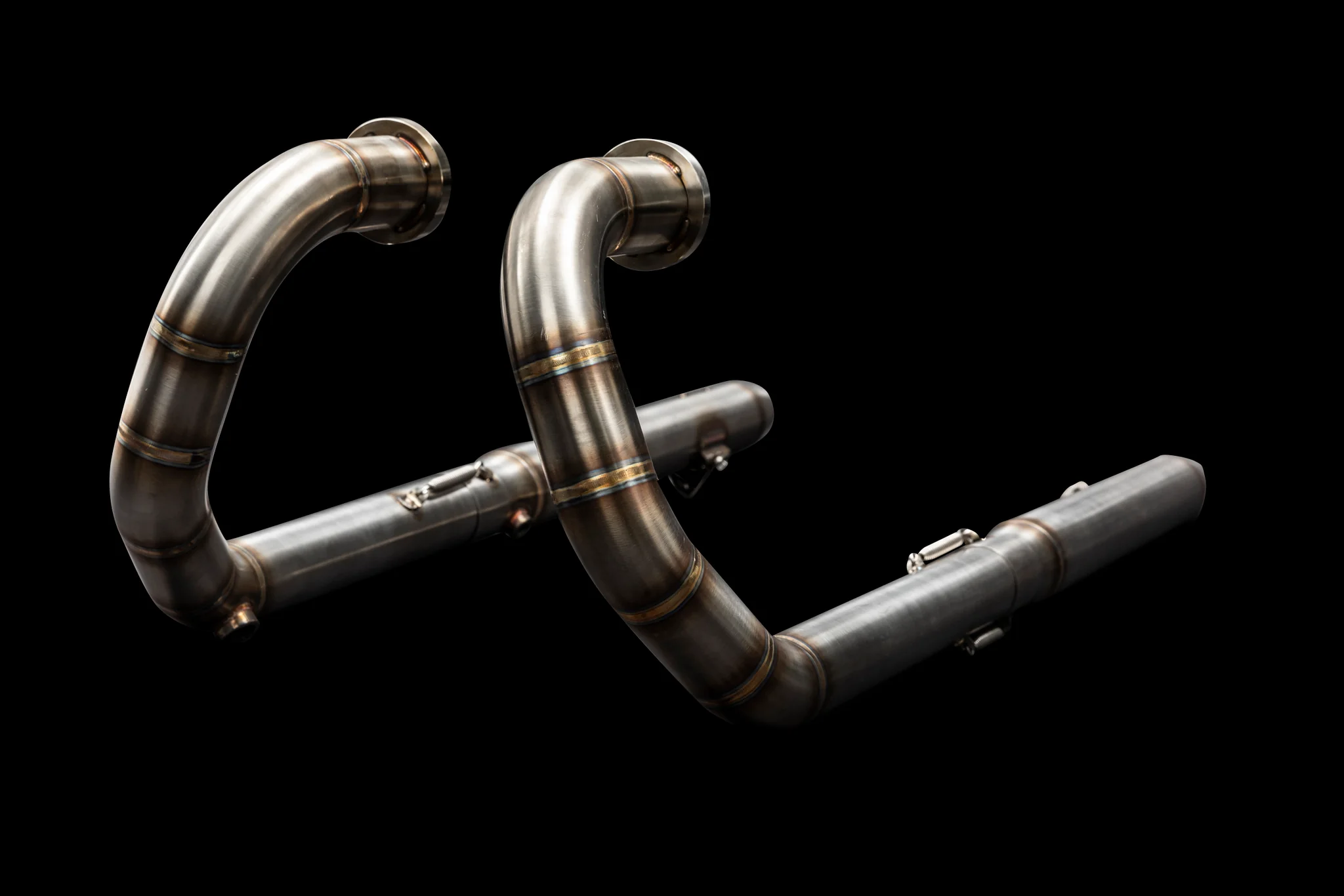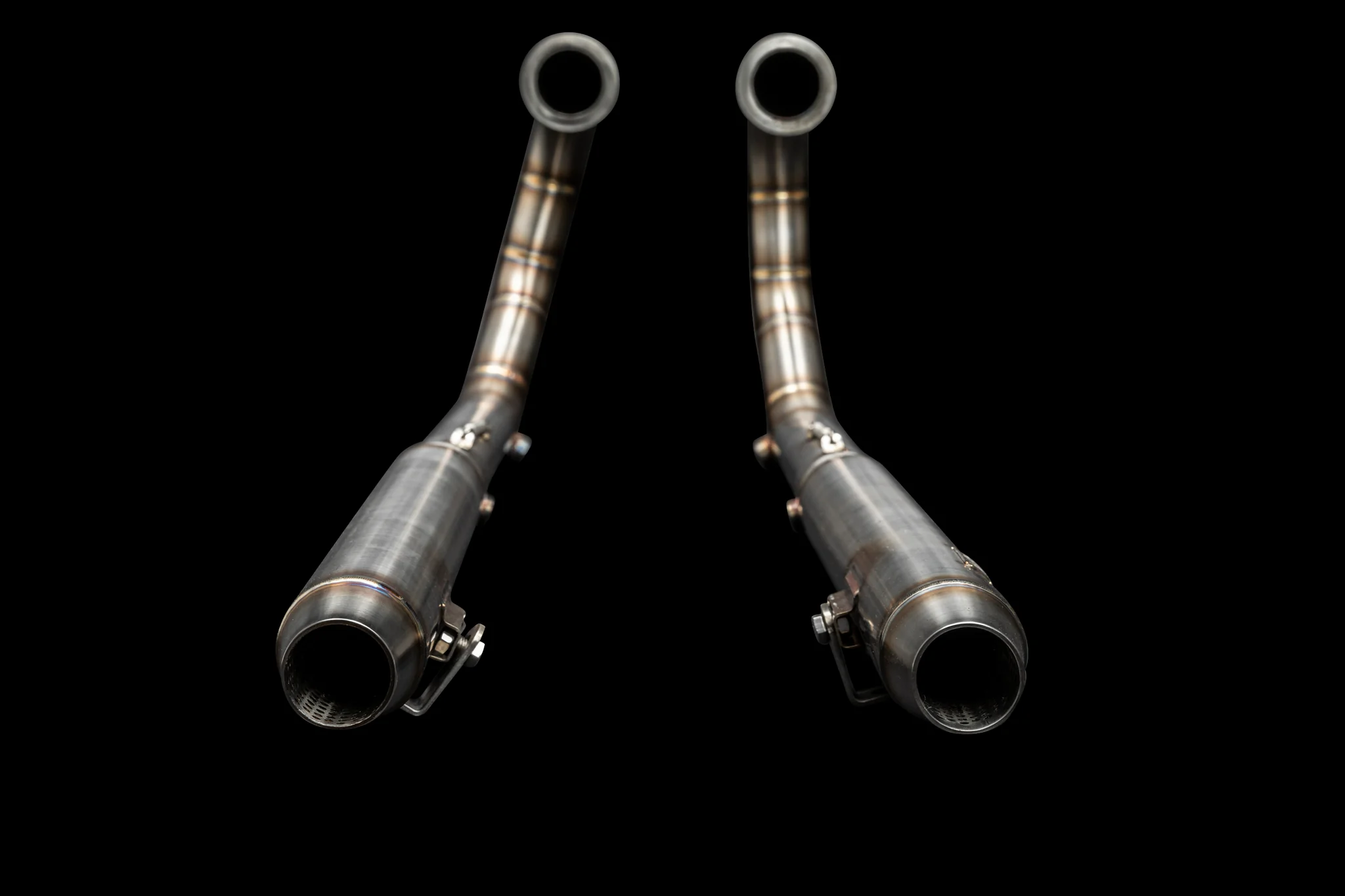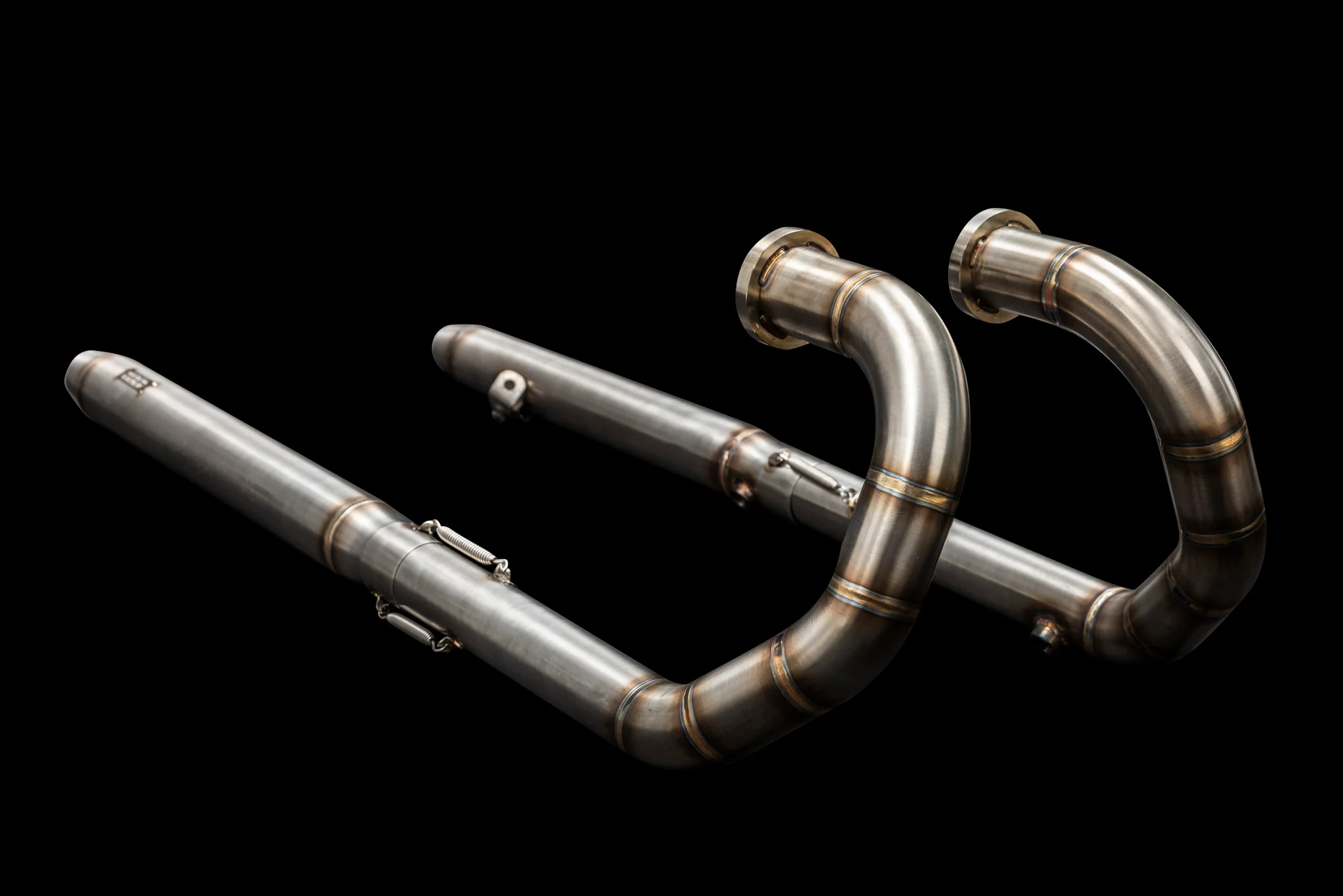 The exhausts are constructed of high-grade stainless steel. The dual exhaust system's tubes have a diameter of 50,8 mm, and it includes integrated hand-shaped mufflers and DB killers.
