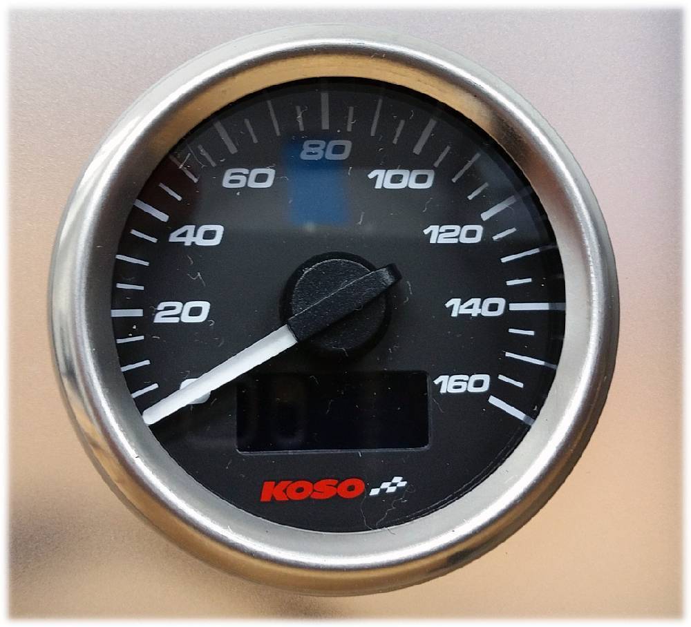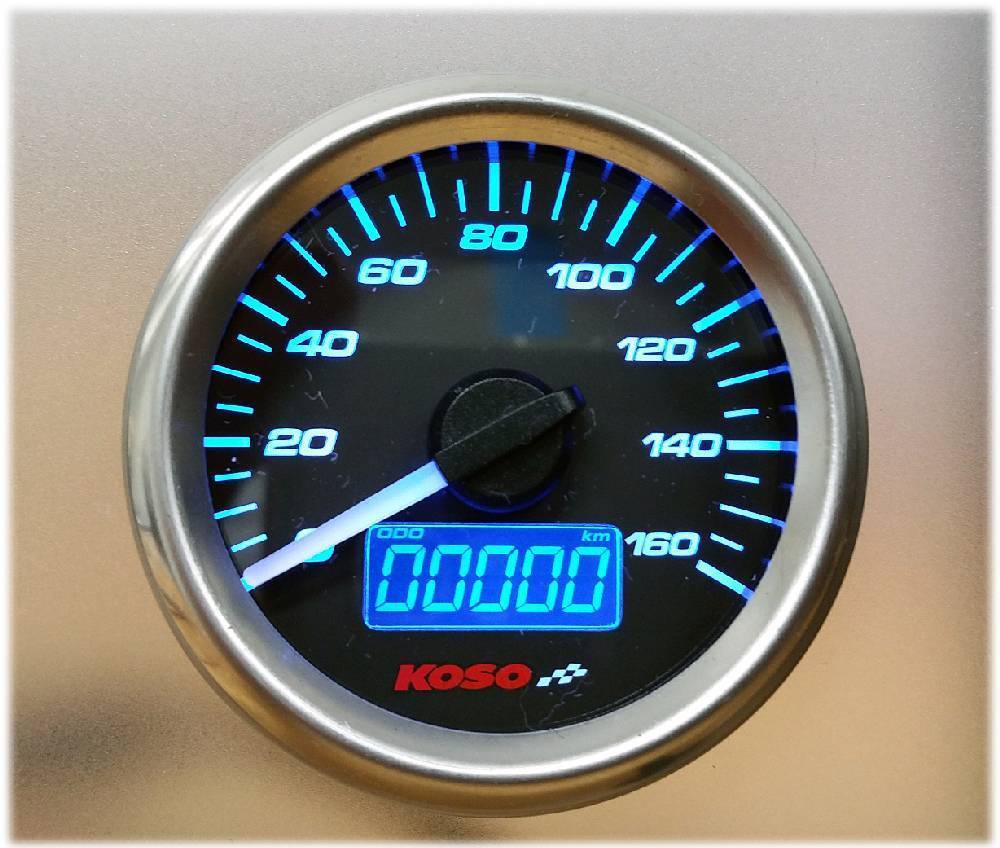 Koso speedometer including gasoline meter with black back plate and blue backlight + hand.