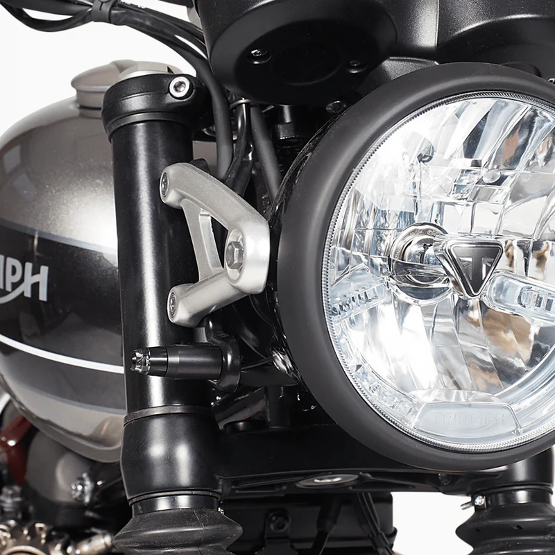 The shape of the adapter fits precisely on the original mount of the Triumph motorcycles and is fastened with the stainless steel screw supplied. The indicators are pushed into the hole in the adapter and secured with the grub screw. The adapters are CNC-machined from aluminium and anodized black. They fit both front and rear.