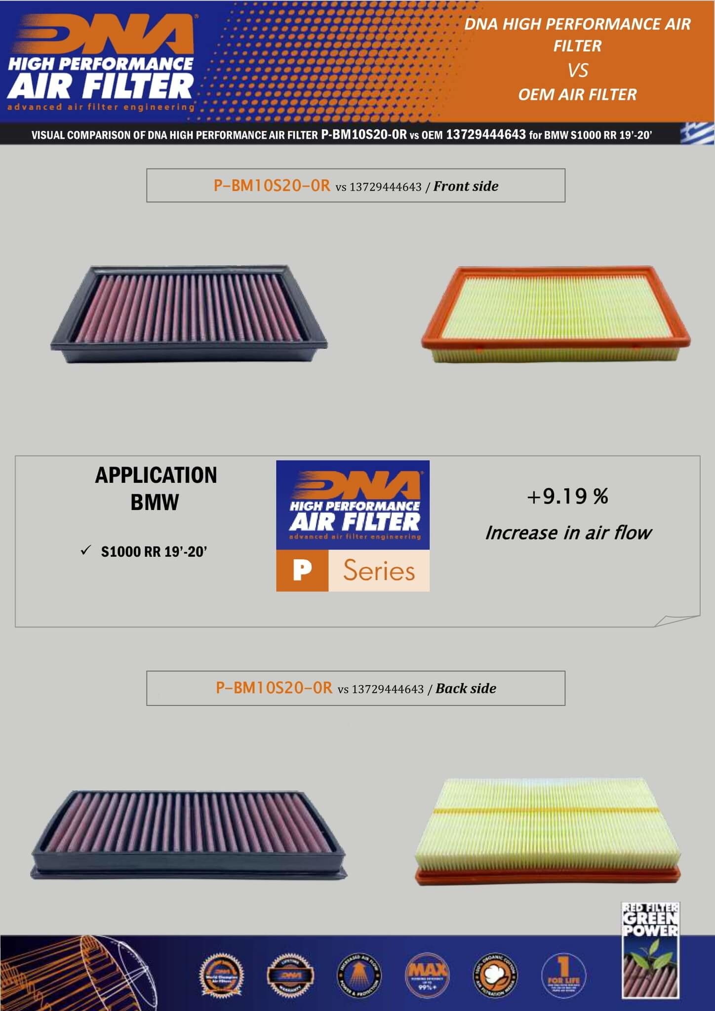 Premium air filter for BMW S1000 RR 2019-2020 (P-BM10S20-0R). Cotton DNA air filters are designed to increase power and acceleration while providing excellent filtration.