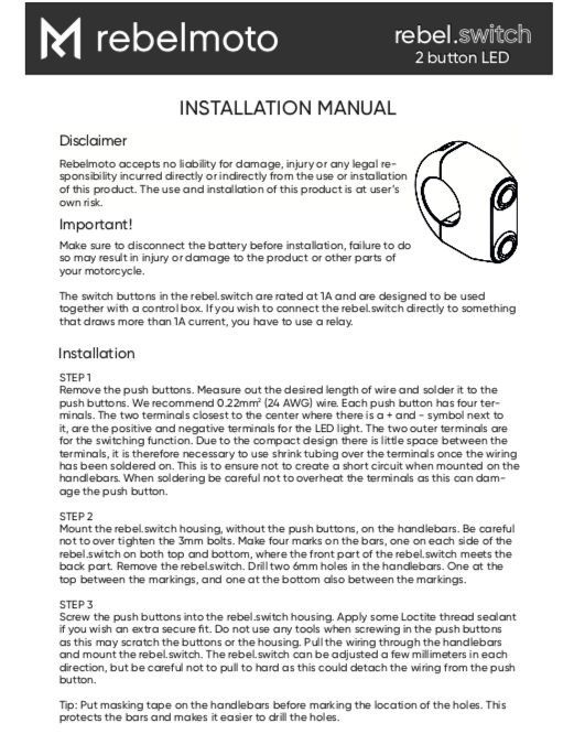 Each housing has two momentary push buttons designed to be used together with a control box, like the m-Unit from Motogadget and can be used to control turn signals, lights, starter, horn and anything else you can think of. The push buttons are rated at 1A and are IP65, which means they can withstand rain and dust. The rebel.switch is mounted to the handlebars using two 3 mm stainless bolts, which of course are included.