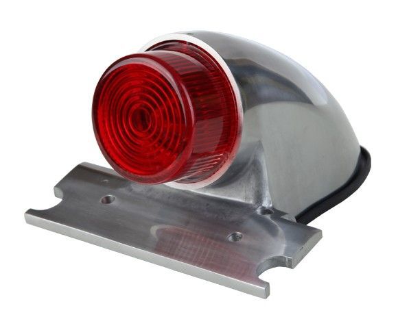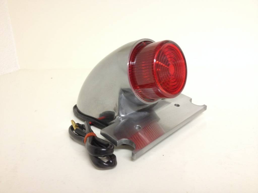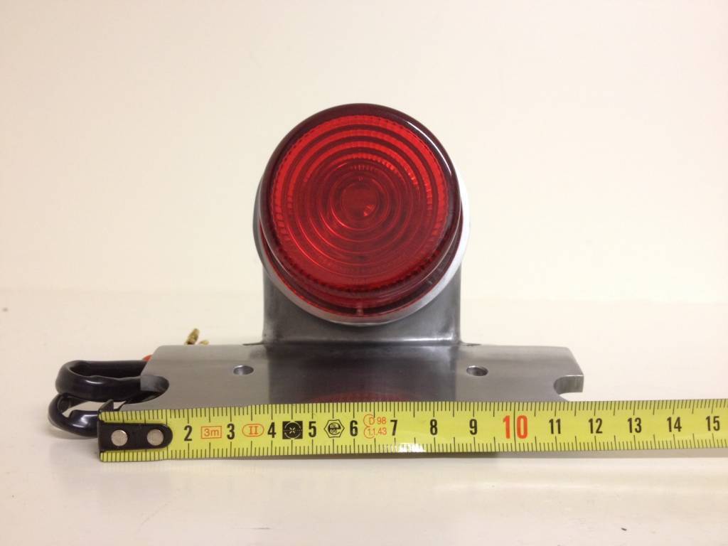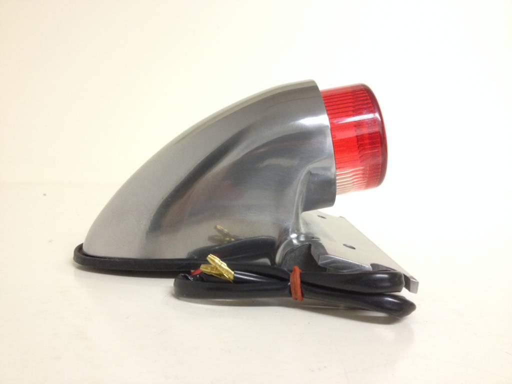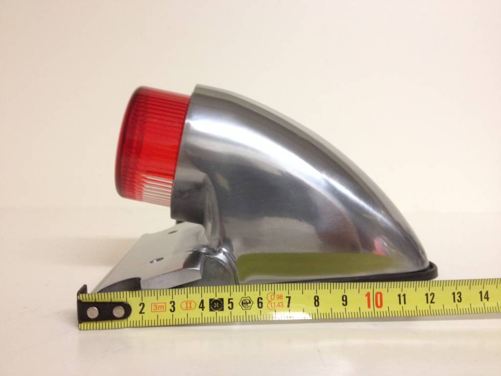 Replica polished alloy Sparto tail light with integral number plate mount and projecting lens.