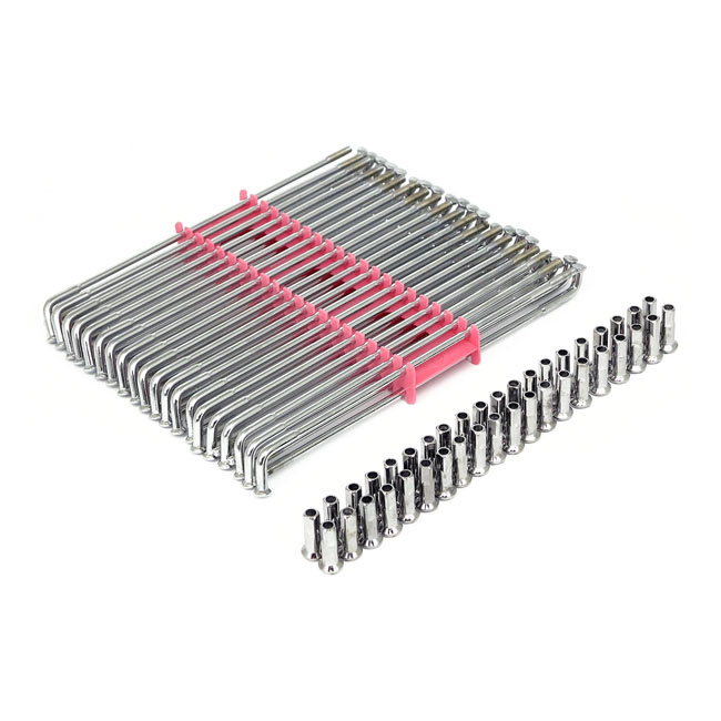 This MCS spoke set is designed for use with 19" rims and 1973-1999 H-D FX Diabolo front/drop-center rims. The set includes 20 short neck spokes and 20 long neck spokes, all with a chrome finish.