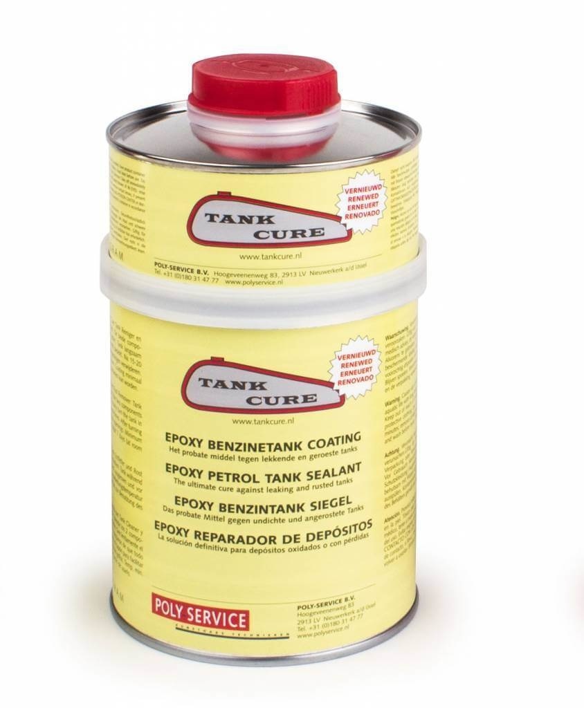 "TANK CURE" tank sealant is based on a 2 component epoxy resin. After adding the two components together stir them thoroughly for a couple of minutes, empty the can in your petrol tank and seal the filler opening properly. Now slowly turn the tank in all directions. Keep turning for about 15 to 20 minutes. The sealant should touch all surfaces several times to form a good layer. Now open the filler cap and put the tank upside down to drain as much sealant as possible.