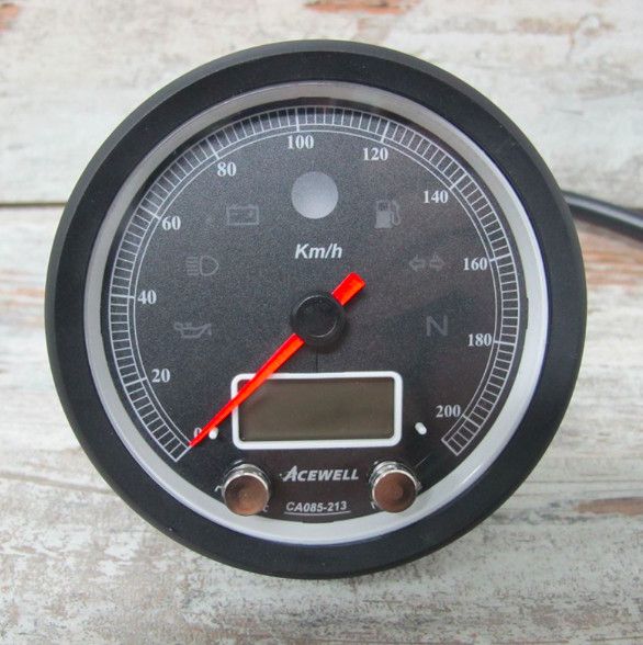 Indicateur de vitesse très complet de Acewell. Il possède une lunette chromée et un cadran blanc. De plus, il possède aussi les fonctions compteur kilométrique et compte-tours. La vitesse est analogique alors que la fonction compte-tours est numérique.
