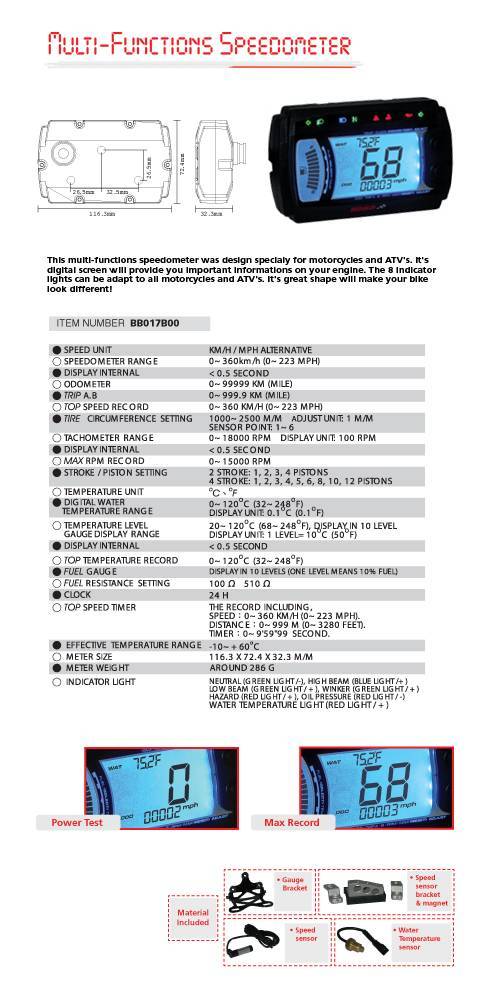 Cockpit numérique multifonctions XR-SRN ABE, avec témoins, rétroéclairage bleu, vitesse, compte-tours, compteur kilométrique, compteur journalier, température de l'huile et de l'eau, jauge de carburant (réglable 100/510 ohms).