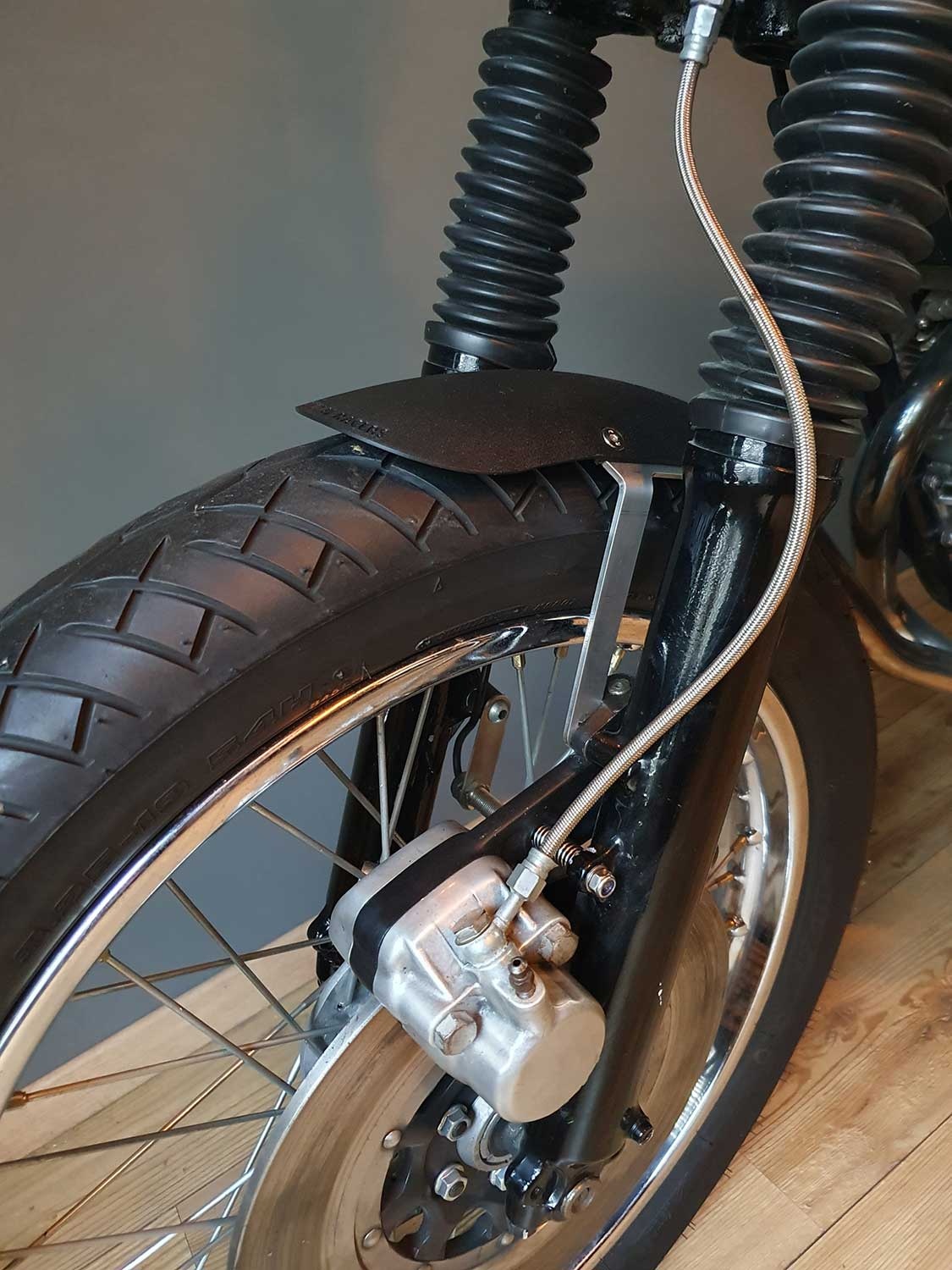 Ces garde-boue avant magnifiquement finis sont spécialement conçus pour les Honda FOUR CB500, 550, 750. Les garde-boue noirs sont très soignés grâce à la finition texturée. Les supports sont en acier inoxydable de 3 mm et peuvent être peints en couleur si vous le souhaitez. Comme les supports ont un trou fendu, le garde-boue est réglable en hauteur.