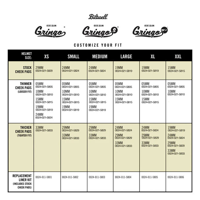 Biltwell propose des coussinets de joues amovibles pour vos casques Gringo, Gringo S et Gringo SV homologués ECE R22.06. Vous pouvez ainsi remplacer les coussinets usés ou sales, ou ajuster votre confort avec un modèle plus fin ou plus épais selon vos préférences.