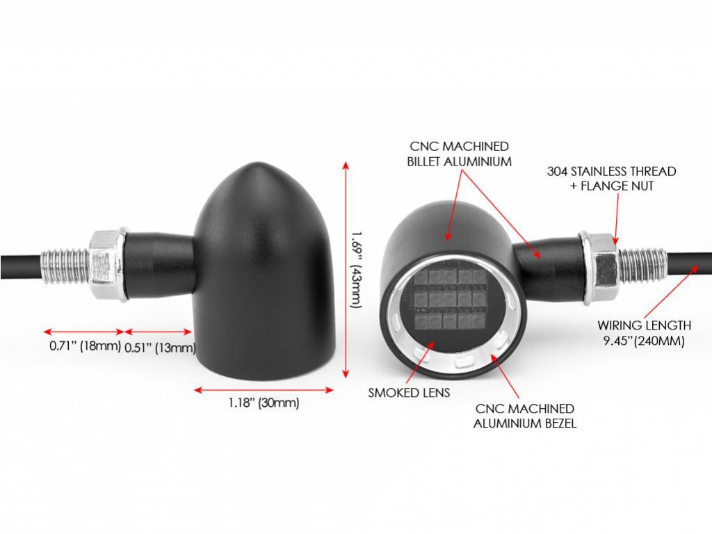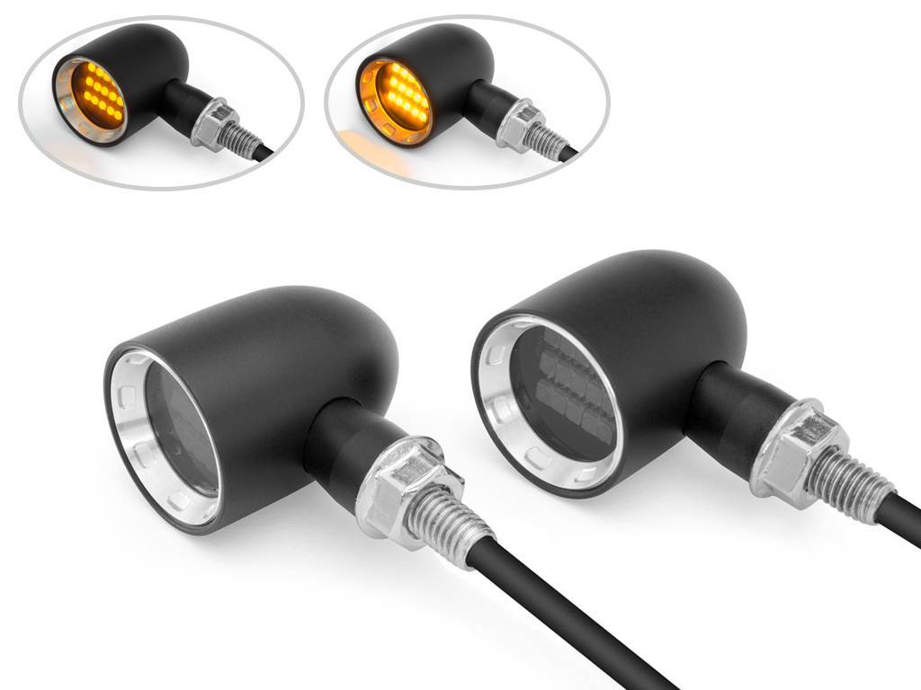 Ces clignotants de très bonne qualité sont fabriqués en aluminium 6061 robuste. L'ampoule LED intégrée fournit une lumière très vive et la lentille est fumée. Ces clignotants sont petits et très lumineux.
