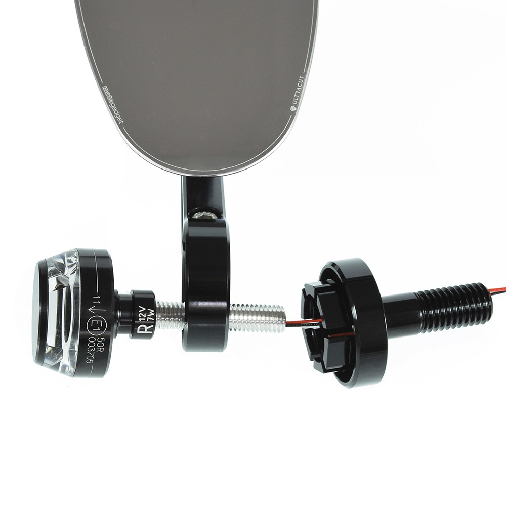 L'installation au guidon s'effectue en vissant le filetage M12 ou M10. Le rétroviseur est ensuite fixé sur l'adaptateur. Le clignotant est également fixé à l'adaptateur.