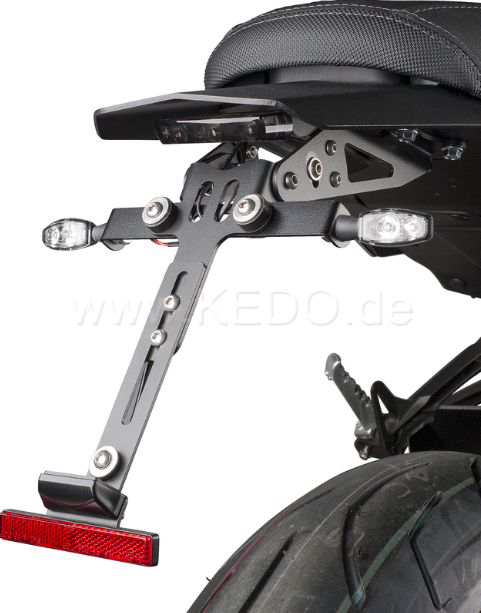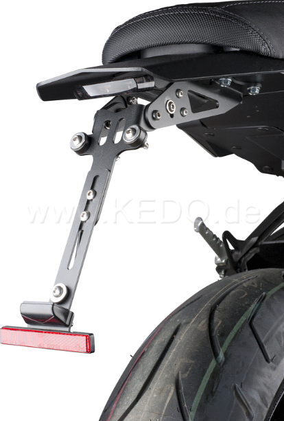 Wrenchmonkees "Monkeebeast" Support de plaque d'immatriculation avec feu arrière à LED et angle réglable. Aluminium et acier inoxydable. Revêtement par poudre noir.