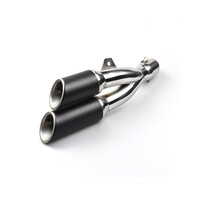 2-1 RVS Twin Demper Zwart 51mm Ø . Deze demper komt in 2 uitvoeringen. Zwart en RVS. De aanlsuiting is 51MM en is daarmee breed inzetbaar. De demper heeft een flauwe bocht waarmee deze mooi wegloopt vanaf het frame.