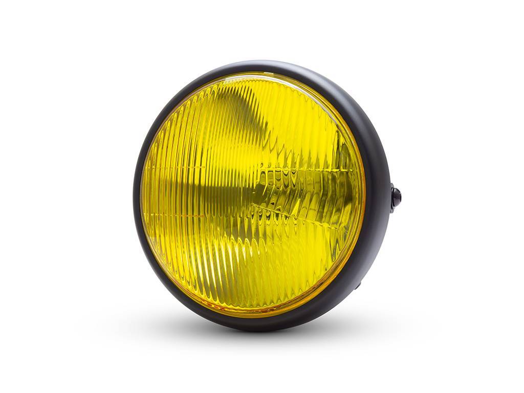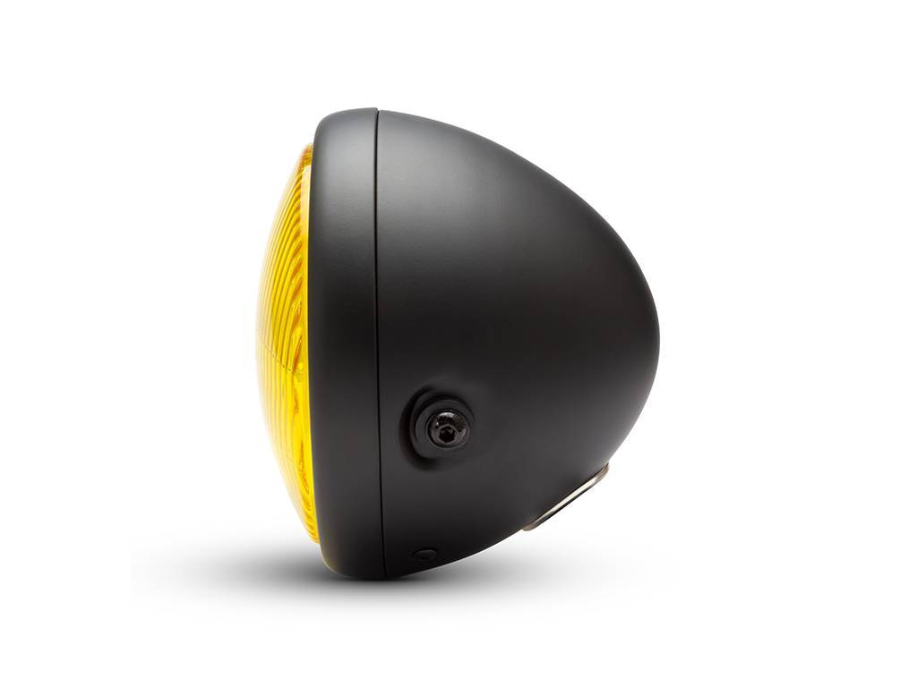 Hoogwaardige koplamp met zijmontage in klassieke stijl met een gele koplamp (halogeenlamp) en een volledig metalen behuizing. Deze koplamp past bij kieskeurige kopers die op zoek zijn naar een kwaliteitsproduct.