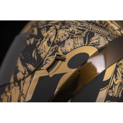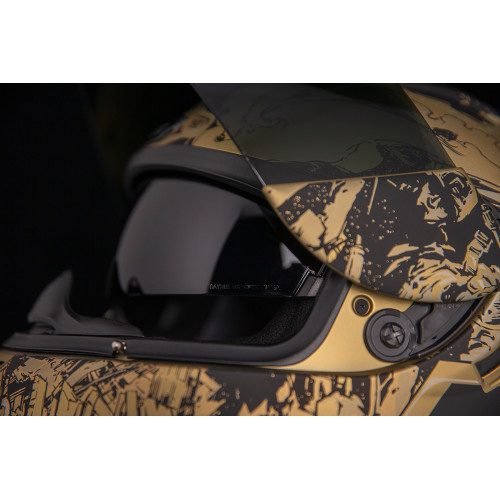 Over de top heen gaan, door dicht oerwoud gebladerte hakken of opstapelen voor een verraderlijke rit in vijandig gebied, de beschuldiging van soldaten verandert nooit echt. Geïnspireerd door huidige conflicten, heeft de Airform ™ Guardian-helm een matte rubatone gouden afwerking over een verbrijzeld landschap, een Fog-Free Clear and Dark Smoke-schild en Dark Smoke interne DropShield ™.