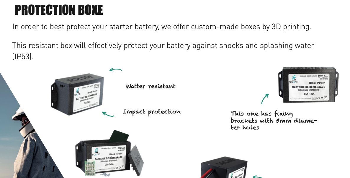 Completely made by 3D printing, this protective box is made to house and protect the battery lithium CCA480 12V 9.2AH battery; It has mounting brackets with 5mm diameter holes; Dimensions: 157 x 118 x 83 mm; Protection box for starter battery.