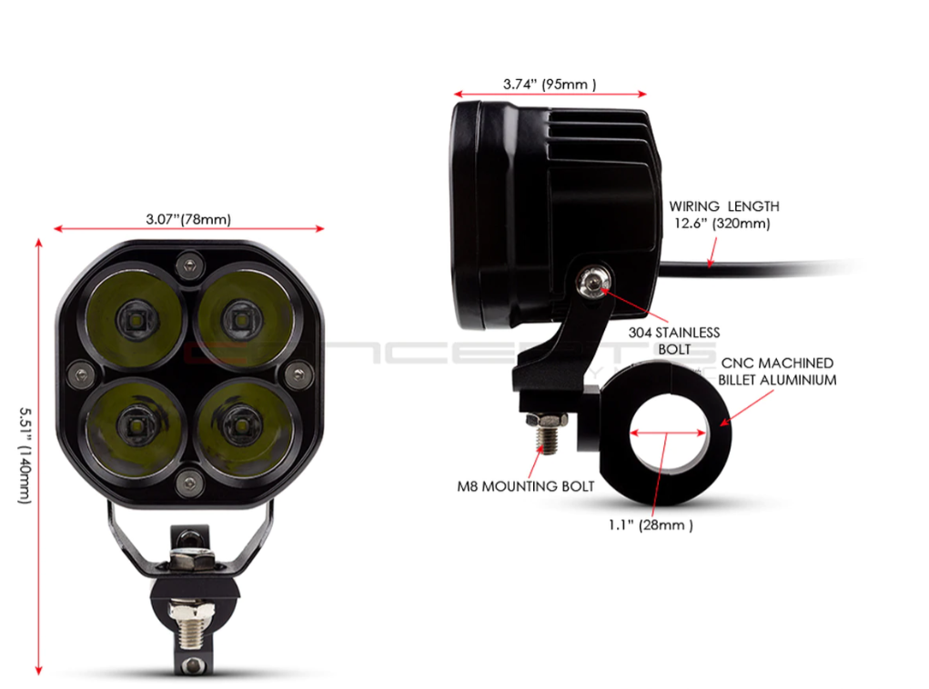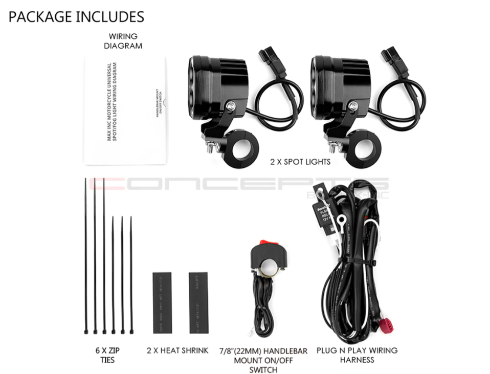 - PACKAGE INCLUDES: 2 X 40W LED SPOT LIGHTS + 2 X BAR CLAMPS WITH SPACERS + COMPLETE WIRING KIT + 6 X ZIP TIES + WIRING DIAGRAM