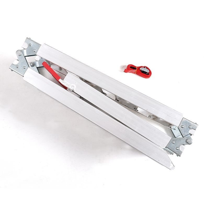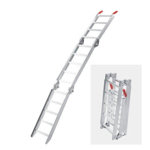 Inklapbare opprijplaat voor bus of aanhangwagen. Robuuste aluminium platen. Wordt geleverd met spanbanden zodat je de motor veilig vast kan zetten. Deze handige oprijplaat is in 3 delen inklapbaar, wat als groot voordeel heeft dat deze oprijplaat eenvoudig is op te bergen in uw kofferbak, laadbak of aanhangwagen.