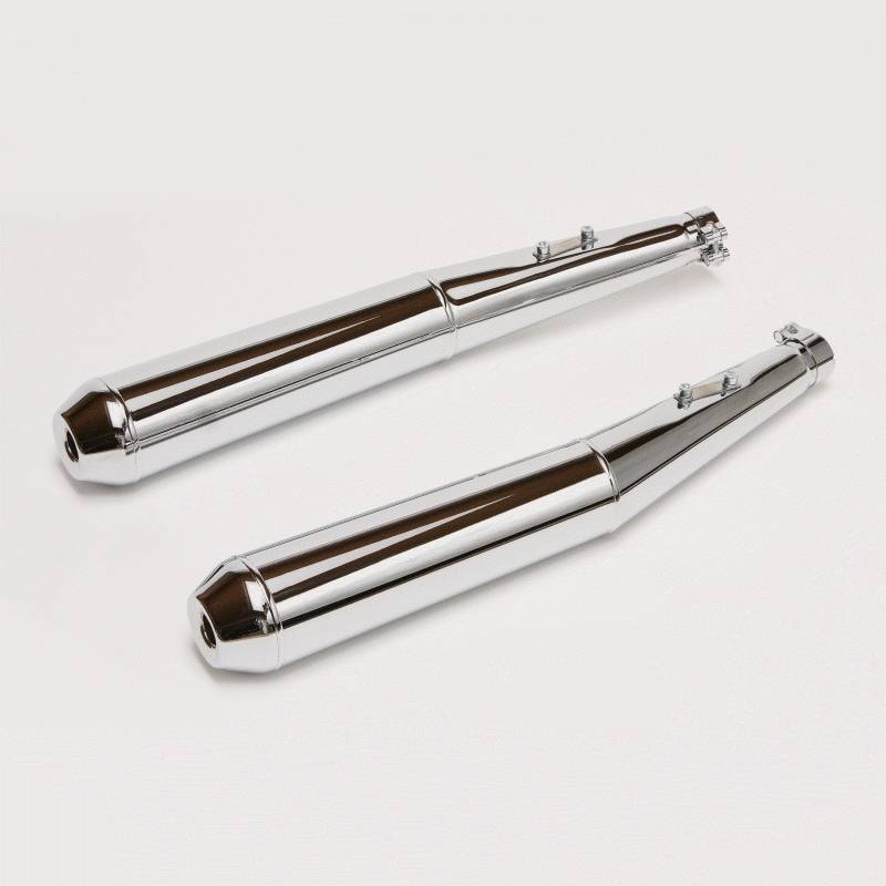 De stalen geluiddempers zijn zorgvuldig verchroomd en stralen uit, zelfs wanneer ze alleen maar gezond nostalgisch staan. Bij zo'n product is het natuurlijk niet alleen het uiterlijk dat in orde moet zijn - de akoestiek moet ook kloppen! Dus tijdens de ontwikkeling was al duidelijk dat het geluid van voorbije dagen weer tot leven zou moeten worden gebracht. Gedempt, rij en fris - de sonore slag van de twee cilinders verlaat de geluiddempers en komt uit in het nieuwe tijdperk en voldoet volledig aan de voorschriften - een voertuigtypegoedkeuring is ook inbegrepen in de levering, net als alle benodigde bevestigingsplaten, klemmen en schroefverbindingen .