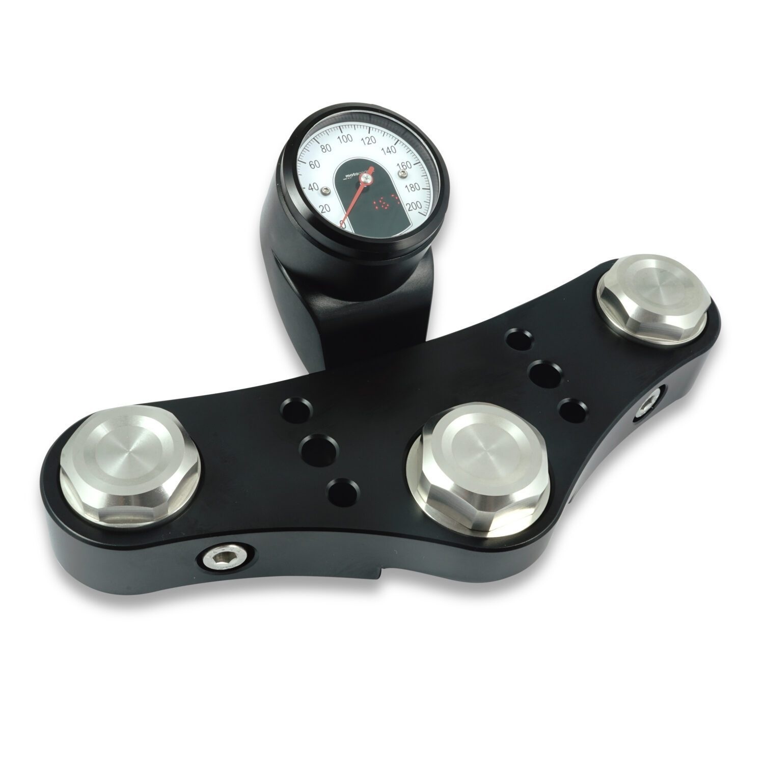 De Triple clamp is ontworpen om te worden gebruikt in combinatie met de Motogadget-serie snelheidsmeters Ø49 mm. Dit omvat de "Motoscope Tiny", de "Mst Speedster" en de "Mst Vintage". De speedo-beugel past perfect op de rebelmoto Triple Tree Clamps, maar kan ook worden gebruikt met andere Triple clamps, die een reserve M8-gat hebben om het te monteren.