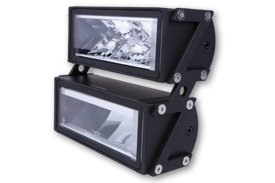 Gecombineerd met een houder in Z-vorm, bestaat deze LED-koplampset uit een grootlicht- en dimlichtkoplamp met positielicht. Aan de achterkant van de aluminium behuizing zitten koelribben.